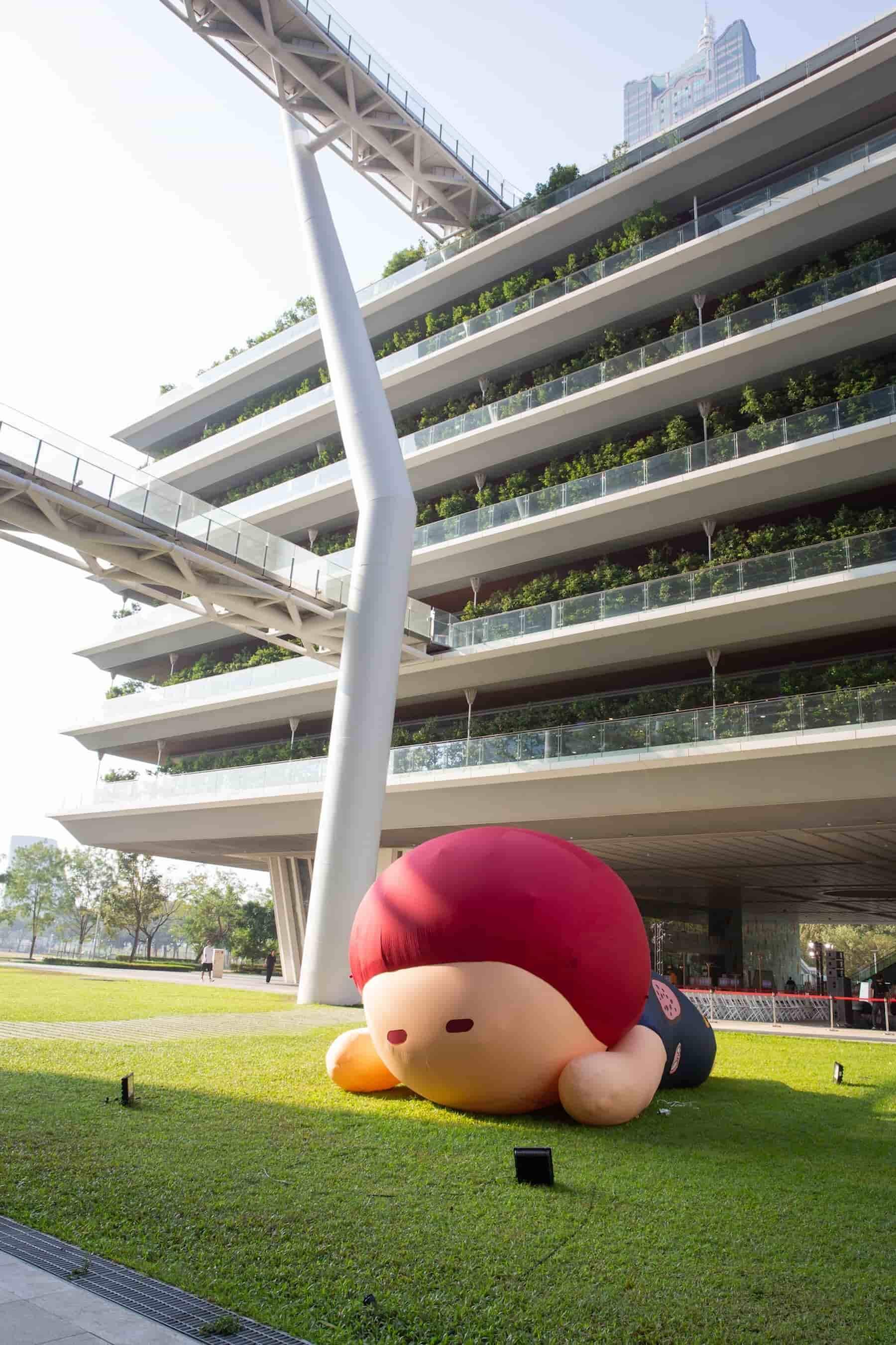 1樓室外與高雄市圖書總館間大草坪有著藝術家寧芮潔的大型人偶裝置「Lazy MOI」。