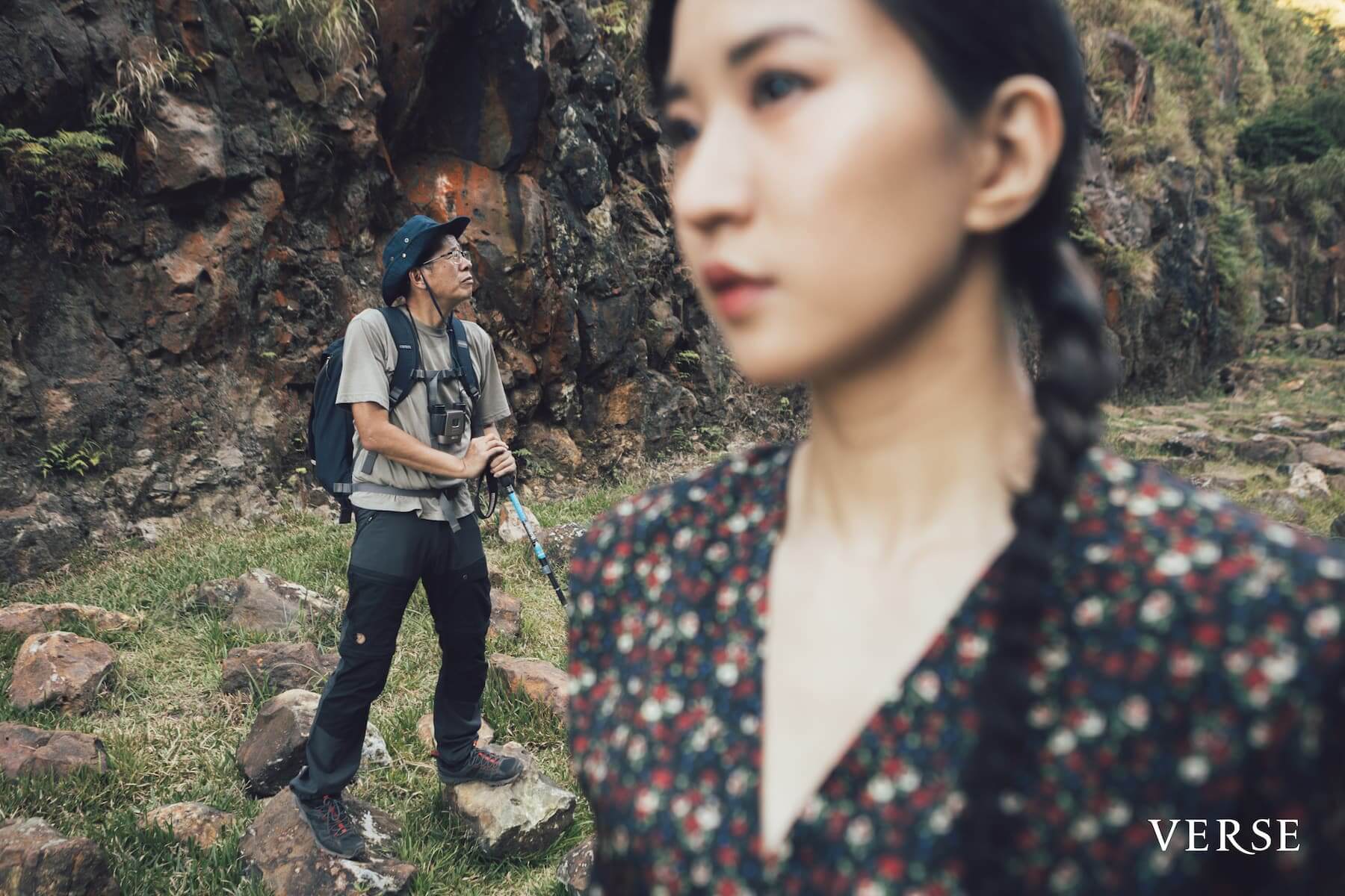 身著健行裝備的劉克襄與打扮俏麗的9m88,一同走在淡蘭古道北路的貂山古道。