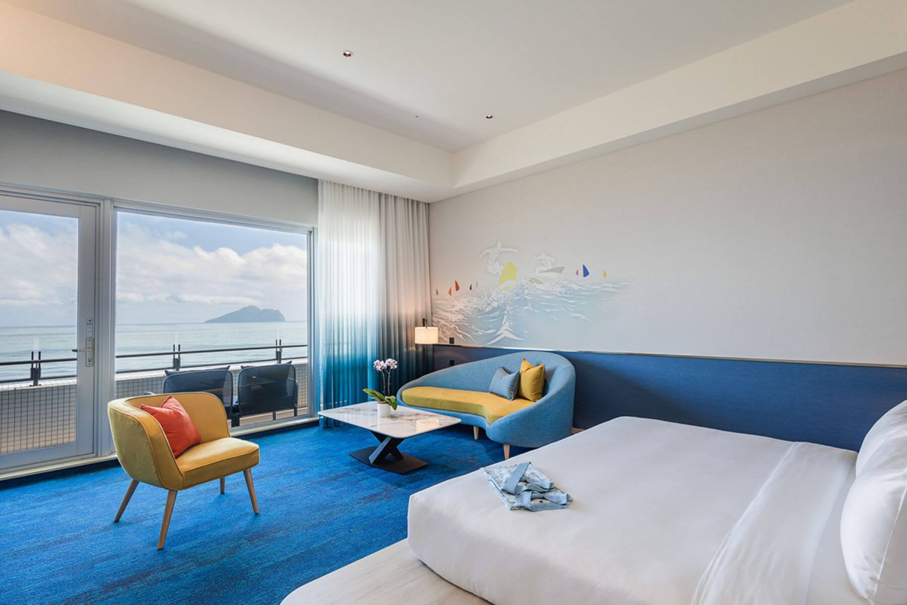 全館60%為海景房,拉開窗簾就是夢幻絕美的龜山島,從地毯、床頭、壁面、沙發至漸層窗紗,不同層次的藍呼應湛藍天空,也洗淨旅人的疲憊;40%為景觀房,房內特別設計圓形山洞,作為大小朋友的秘密基地,享受靜謐山嵐之美。11樓至12樓天際客房可眺望最遠天際,獨擁無邊際碧海藍天與最寬闊空間,一泊二食晚餐搭配archi藝廚,星廚精緻套餐,奢享極致完美假期。