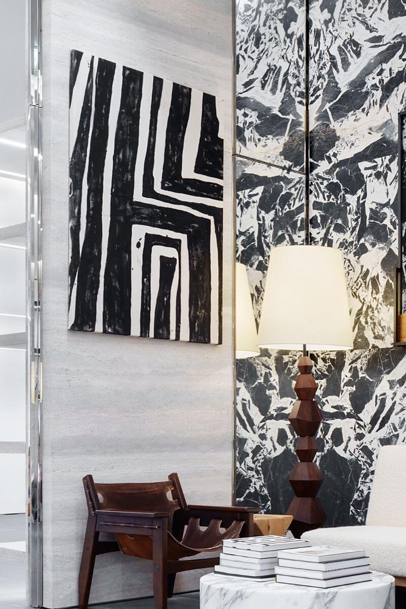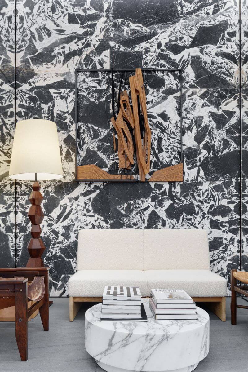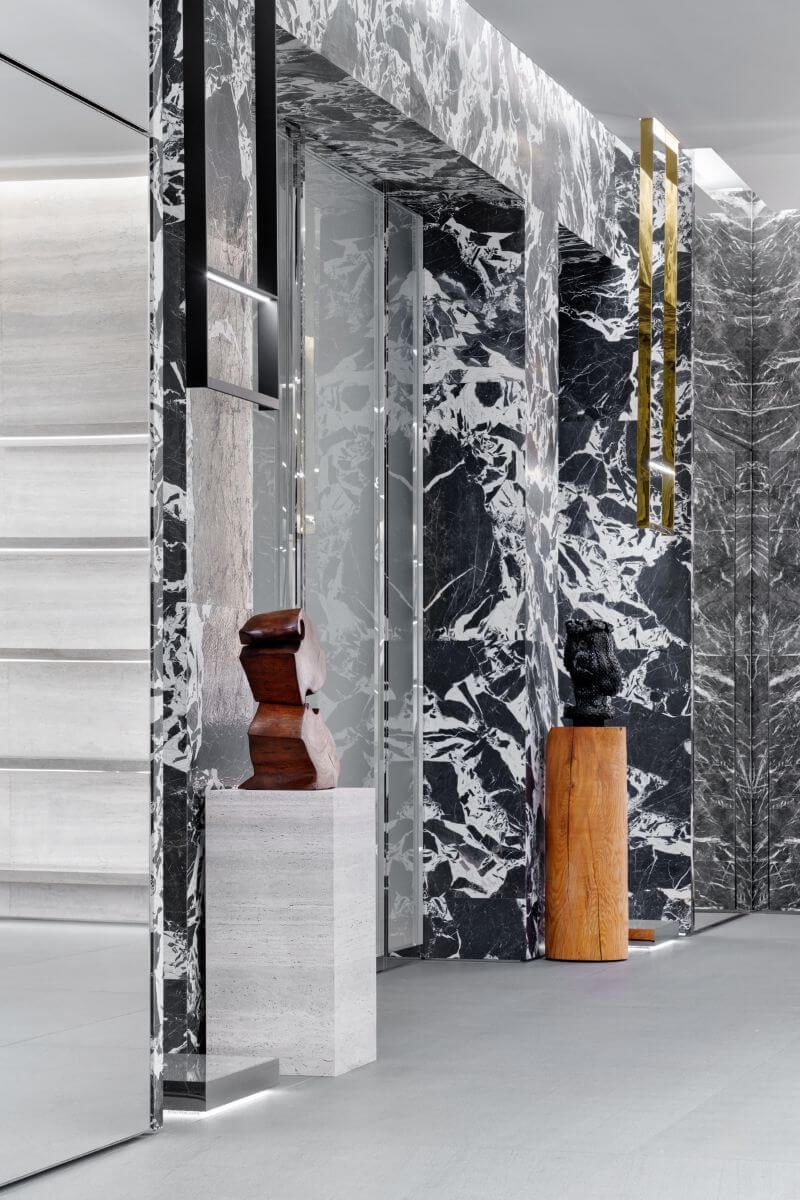 裝潢以石灰華和經典大理石等天然石材色調為主,搭配橡木、黃銅、復古金色鏡面等暖色調,形成對比摩登的映照與對比,為粗獷主義美感增添精緻與優雅。