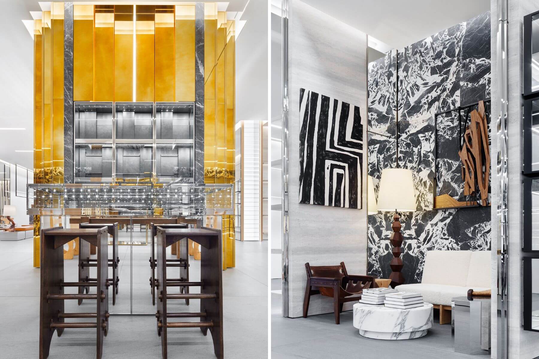 地面鋪滿大片義大利巴薩崗石,牆面點綴大理石、黑色飾漆、鏡面及鉻金屬,在古董金質鏡面和風琴式展台襯托下,令高訂香水系列更加矚目。