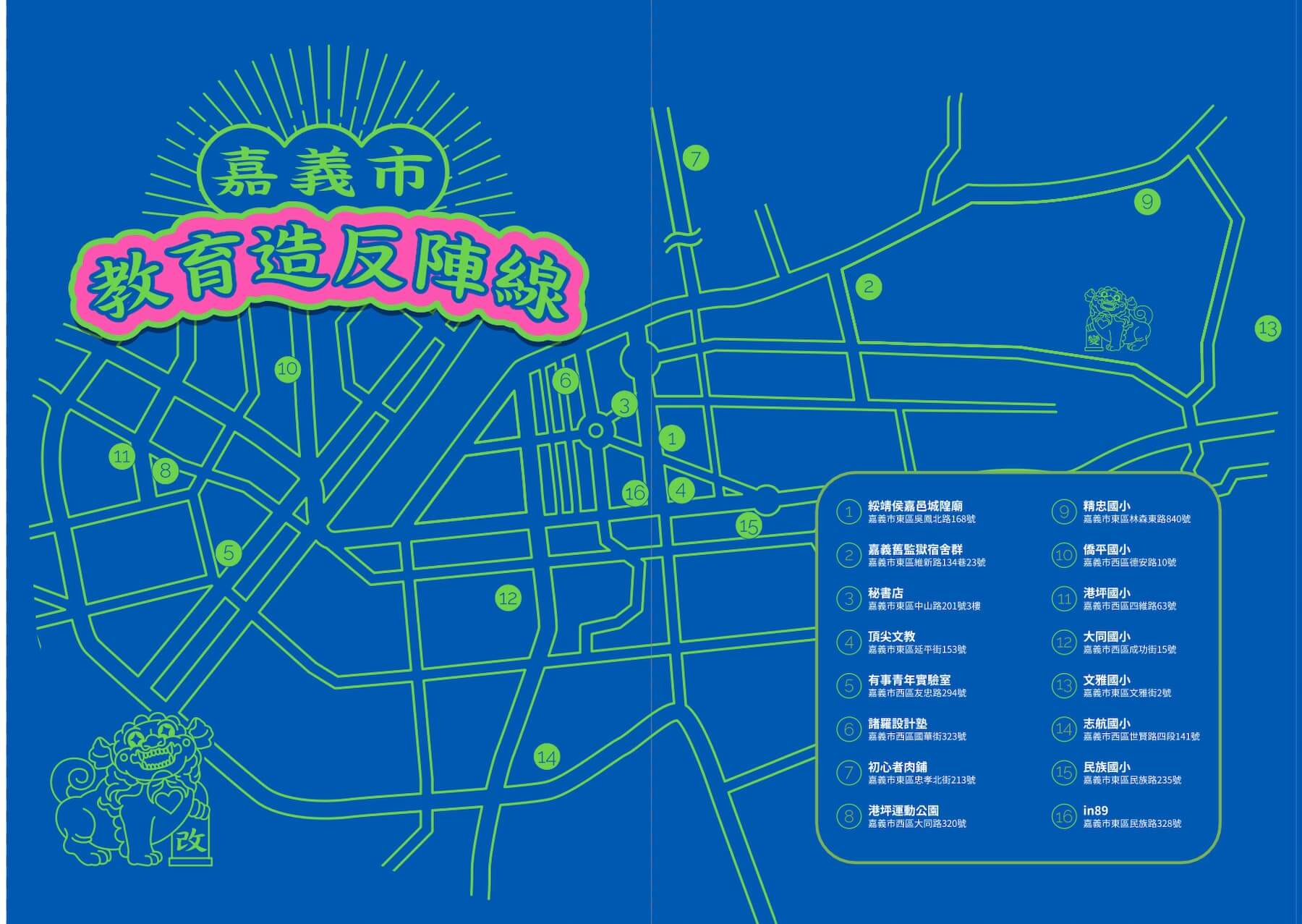 活動主場地,特別選在嘉義文化信仰中心,綏靖侯嘉邑城隍廟舉辦,傳達在地學、處處學、時時學的概念,邀集包括嘉義市八所國中、「臺灣吧」與「美感細胞」等,具有「造反」基因的新創教育團隊參展。