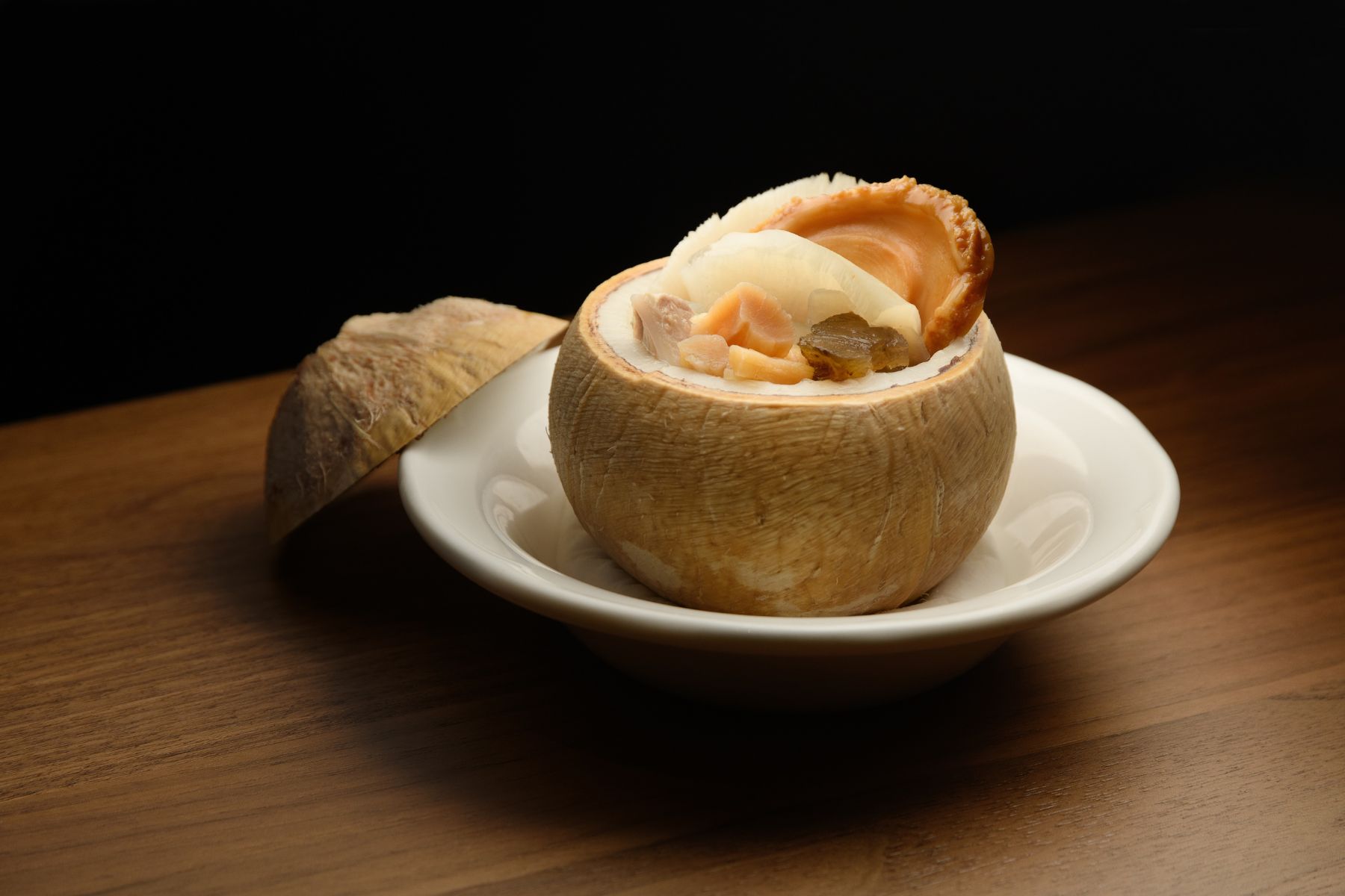 「椰香佛跳牆」以造型可愛的香水椰子為盅,打開椰蓋,魚翅、鮑魚、花膠、海參等高檔食材誘人食指大動。羅嶸巧妙的將慢熬的鮮醇上湯與新鮮椰子水結合,多番琢磨調整出黃金比例,讓湯汁入口初為雞高湯的鮮醇,抿唇享受滿滿膠質時,輕盈的果香像小精靈般在味蕾間躍動,結尾甜爽的南洋風顛覆原本佛跳牆的老派。若說古時候「佛聞棄禪跳牆來」靠得是輕功,為嚐現代版「椰香佛跳牆」的老和尚,必是施展花式滑板的高超技術「嘻哈」現身。