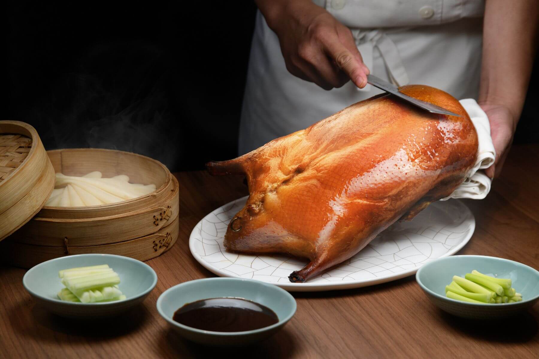 看準台灣人愛吃「片鴨」,東方樓特別請來米其林星級餐廳的烤鴨師傅坐鎮,烤鴨選用2.8至3.2公斤的宜蘭櫻桃鴨,師傅認為,這樣大小的鴨,肉質細嫩、油脂豐腴,最適合拿來做烤鴨。醃漬、打氣、燙皮、上醋水、風乾、冷卻、回溫鬆弛等繁複的工序後才能進到爐烤。為了讓鴨皮呈現鬆而不化、脆中帶爽的口感,醋水中的麥芽糖改以蜂蜜替代,同時還特製了一台冷藏設備,讓鴨在爐烤前靜置吹風一夜。細細品嚐能發現鴨皮隱藏一股神秘燻香,原來,師傅在烤爐底層鋪放石頭,當鴨油受熱滴下時,噴出焦香回燻到鴨皮上,讓鴨皮的香氣更有層次。
