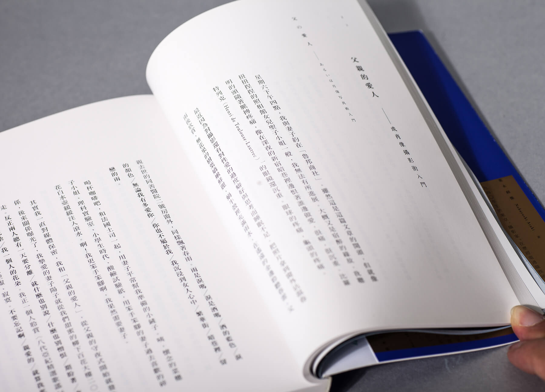 當時無意間接觸來自網路上其他國家的字體(笑)。所以有機會比較、測試更多不同風格的明體,最驚豔的是以森澤「龍明」體編排的內文所呈現的氣質。之前講座提到的「文氣」,其實是使用這個字體的感受,第一次以龍明完整表現是在《寫真=愛》一書。後來在台灣接觸森澤時,即買了授權。