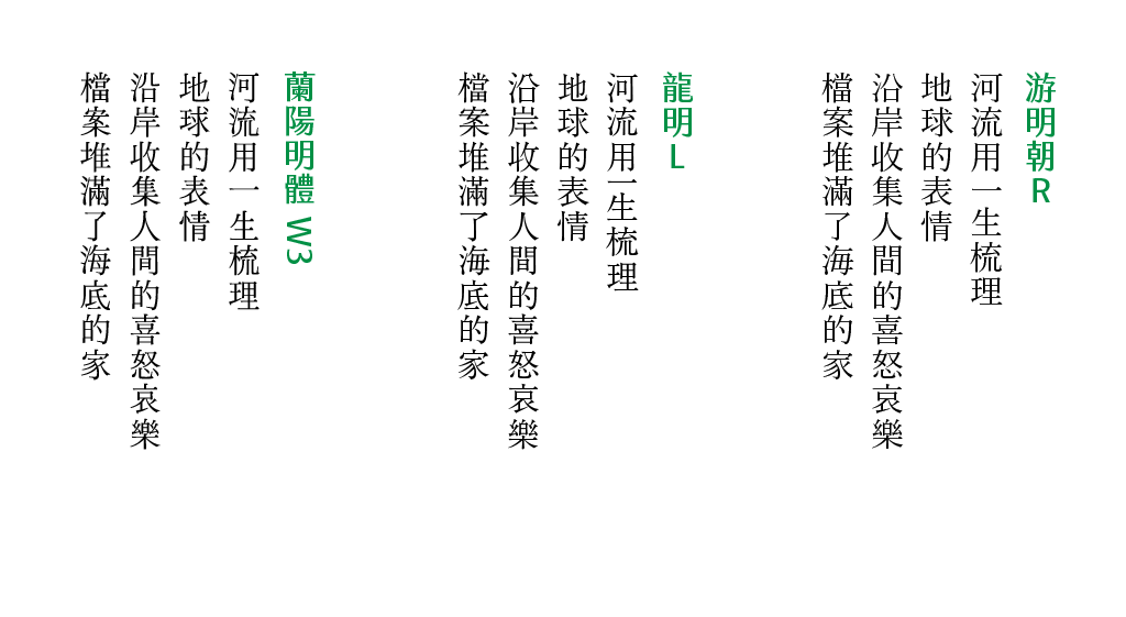 何:從你們提供的2020年公車捷運詩文展的例子,字體有兩個不同的粗細,這兩個字重的空間感不太一樣,我會比較偏向標題字重的空間感,也覺得蘭陽明體較適合直排,直式的行氣在現代明體是少有的。如果在混搭各種字體的書籍內頁版式,我會將蘭陽明體使用在引言。