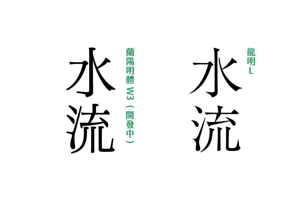 何:欣賞蘭陽明體目前溫潤內斂的感覺,線條的流動是細緻的。也有些建議:流下面的「川」的頭點,如果是趨向復古的話,那讓這三個頭點的造型有動態變化的感覺,龍明朝是這樣的變化,筑紫、游明朝就是頭點統一。