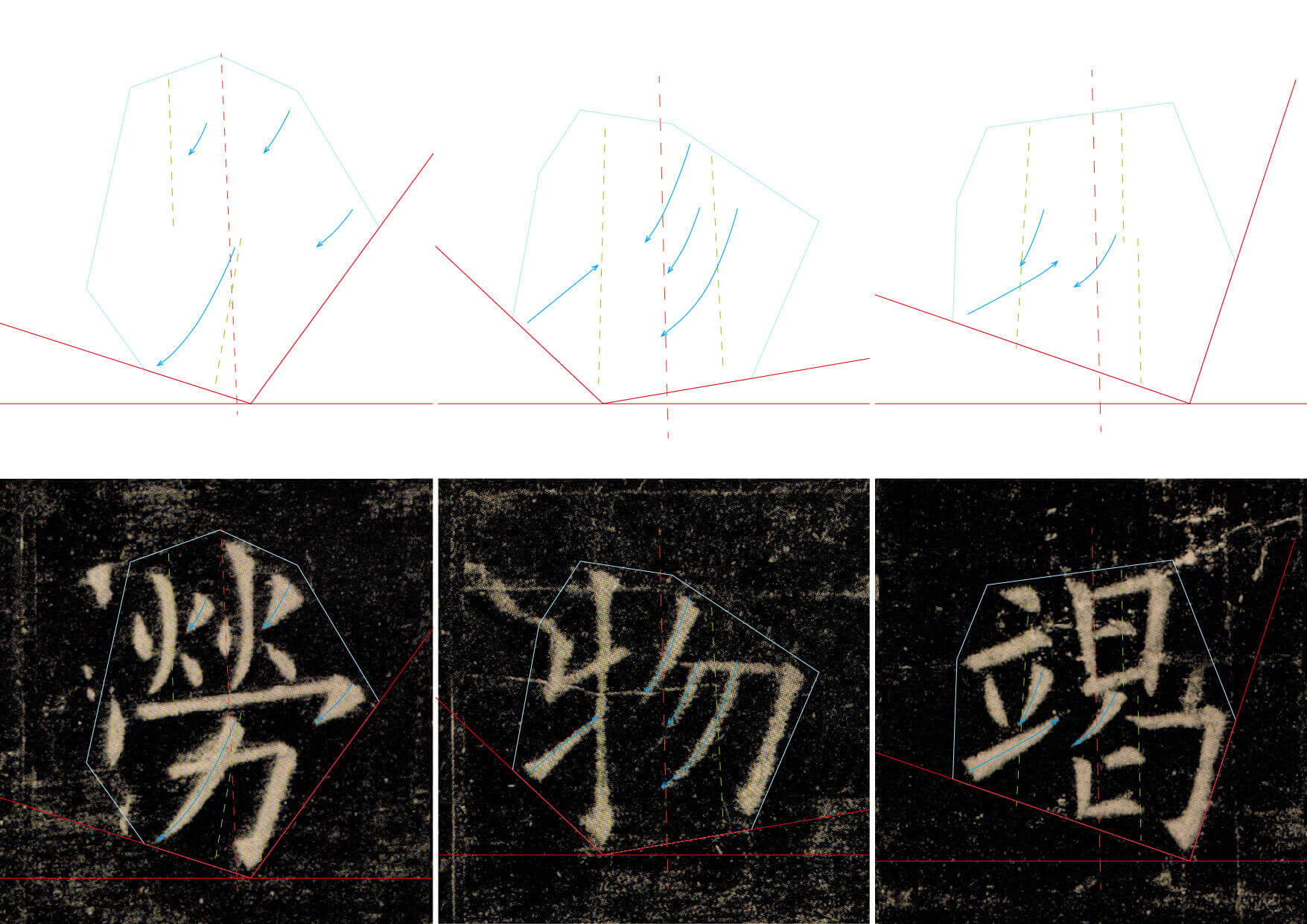 另以邱振中(中國書法家)的論述為例:以發展至極致的唐楷〈九成宮醴泉銘〉來看,標示出字的中軸參考線,會發現其楷字多數呈現動態平衡。標示出字的外廓參考線時,會發現字以倒三角形造型平衡站立地面。這就是東西方線條的一種分野:一個講究凝結、一個講究運動(行為)。亞洲現代字型的發展將趨向動態平衡,觀察近年歐美字型也從經典的垂直平衡軸線偏向動態。