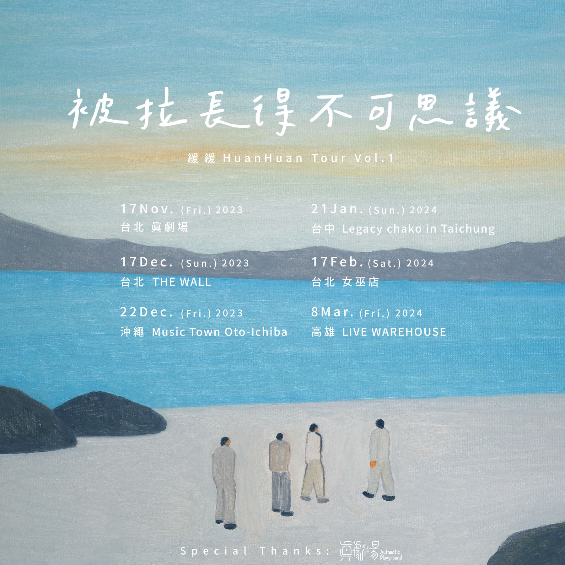 《被拉長得不可思議》即將在11/17於台北的真劇場正式開跑。巡演橫跨台北、台中、高雄和沖繩,名稱除了來自〈瀏海被風吹得整個飛起來〉的第一句歌詞「想念被拉長得不可思議」,也是呼應一個月至少一場、長達半年以上的巡演計畫,活動詳情可再至緩緩Huan Huan官方粉絲專頁、Instagram查詢。緩緩Huan Huan也呼籲樂迷盡快購票:「為了專輯的第一場演出我們已經在密集練團,敬請期待!」
