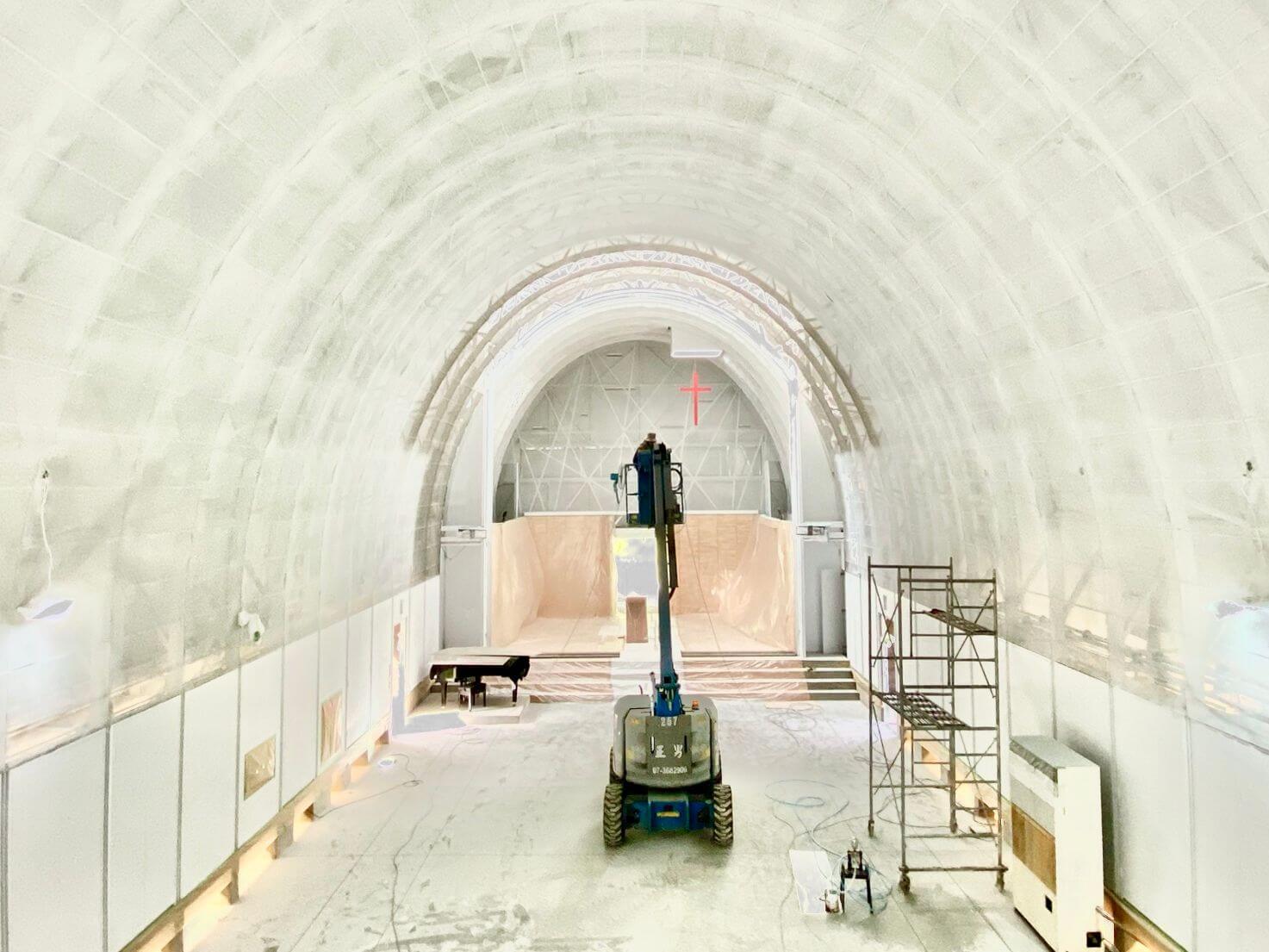 育幼院的教堂,是一座被行政、住宿單元包圍的鋼構建築,輕鋼構拱型屋頂結合鋼筋混凝土樁,與外掛木製雨淋板外牆,是他一向的輕質與混合的表徵,以及長年推敲的鐵皮屋建築構件再進化的建築語彙。教堂的內部空間顧及主堂的公共性,以及平時院童生活客廳的多功能性質,在神聖與日常之間找到間接共生的平衡,而內聚在日常生活裡的精神性。