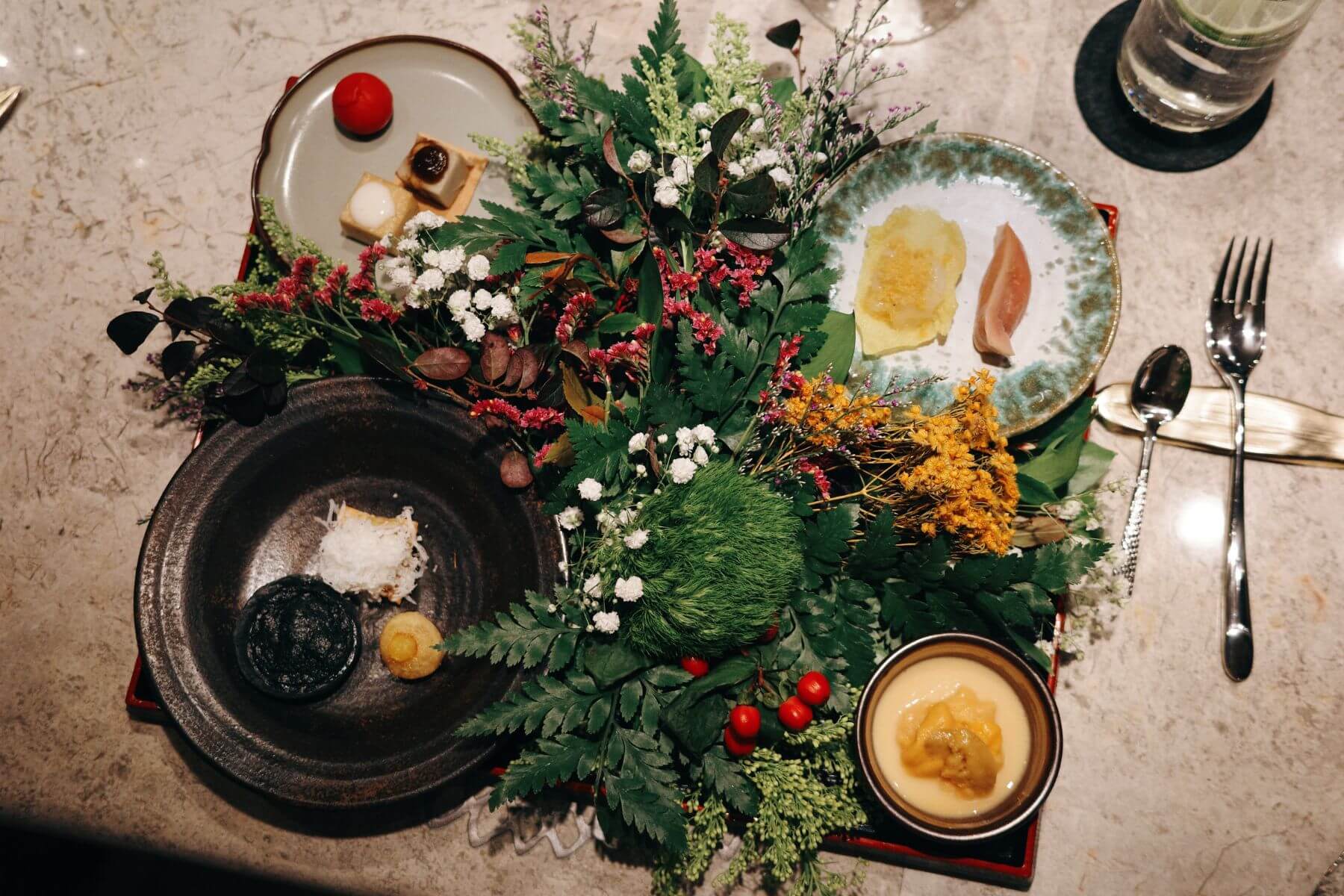 仲嶺淳一也帶來多道鎮店招牌料理,如「油封蛋黃、煙燻腰果醬佐魚子醬」做為開胃餐點之一,更以台灣食材、花飾重新詮釋他的經典創作,如「溫沙拉、奶油醬」及「花春捲(Spring Roll)」等,以真摯誠意,共創跨越料理文化疆域的絕倫美味。