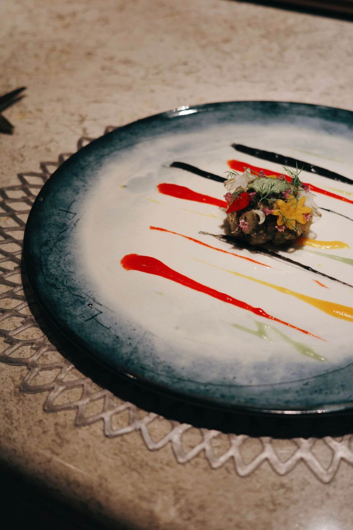 將蘿蔔煮成液體後處理成片狀、並進行醃漬,做成各式各樣的形狀。韃靼外圍環繞黃(番紅花)、綠(韭菜)、黑(竹炭粉)、紅(紅心蘿蔔)等四色特製醬汁,新穎風味和精緻外觀展現La Kanro獨有風格。