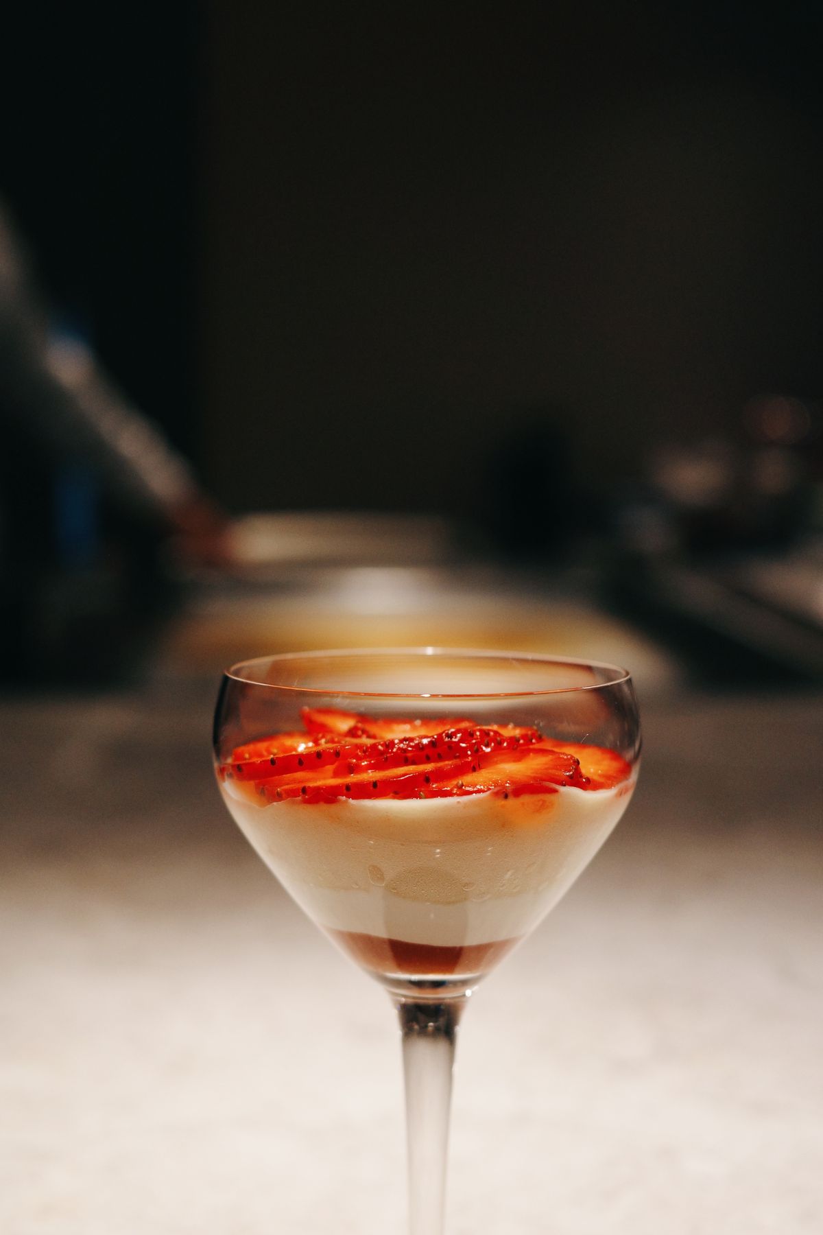 在日本最受歡迎的草莓奶油蛋糕,經過主廚的分解、再建構,以非蛋糕形式重製呈現。自底部而上,以濃縮草莓醬、奶油鋪墊,再來是海綿蛋糕慕斯和最頂層的新鮮草莓片,Pairing則搭配清爽甜酒完美作結。