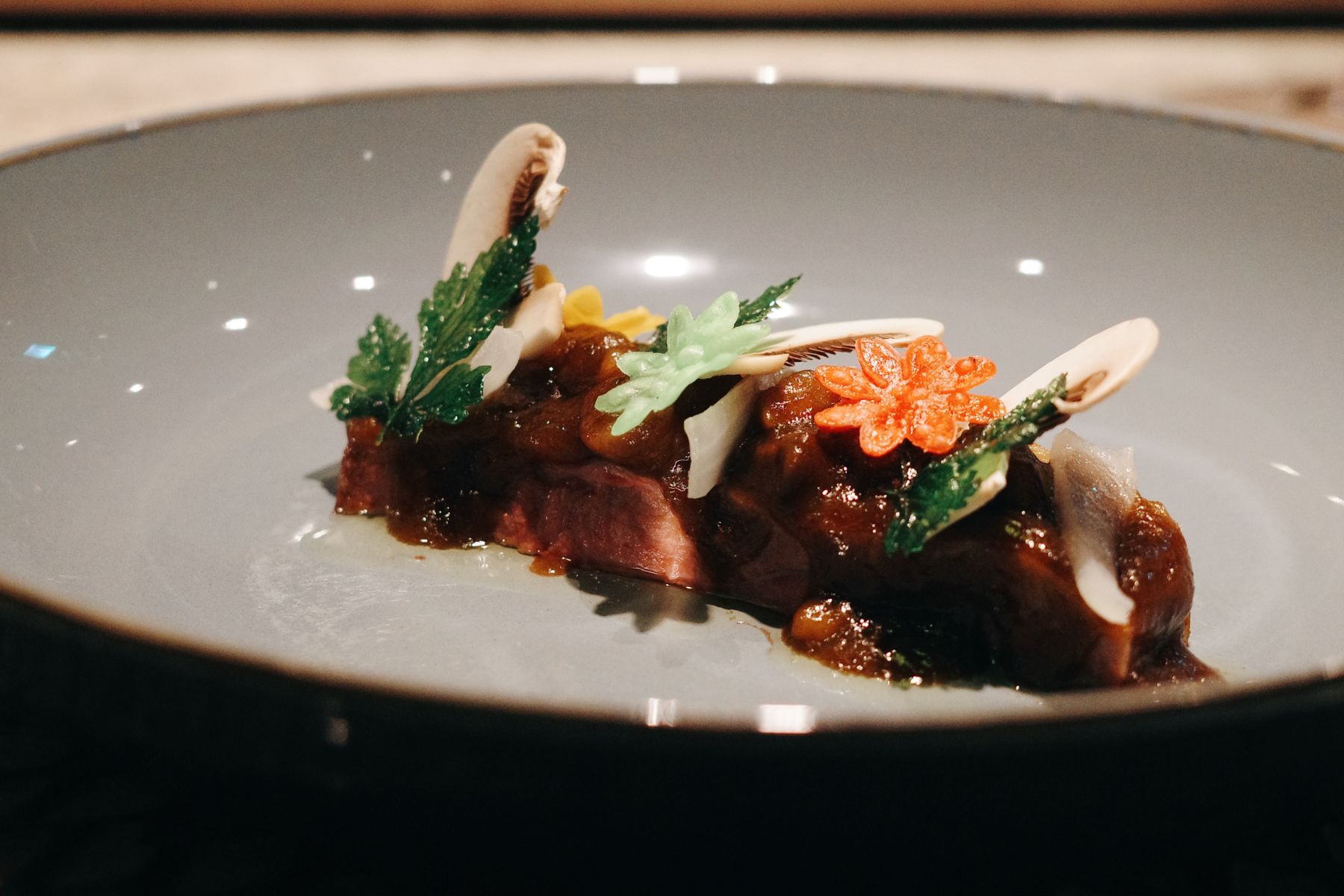 選用台灣胭脂鴨,醬汁為法國栗子搭配澄清奶油(Beurre clarifié)調製而成的鴨肉肉汁(Jus),充滿香氣、甜味撲鼻,與鴨肉相佐令人欲罷不能。