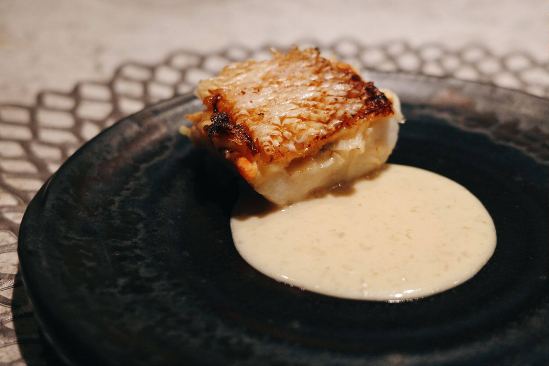 香煎(Poêlé,使用鐵板,蓋上鍋蓋以小火慢慢悶煎)甘鯛,並加入竹筍與櫻花蝦的季節慕斯,醬汁為梅子風味的白葡萄酒(Vin Blanc)。