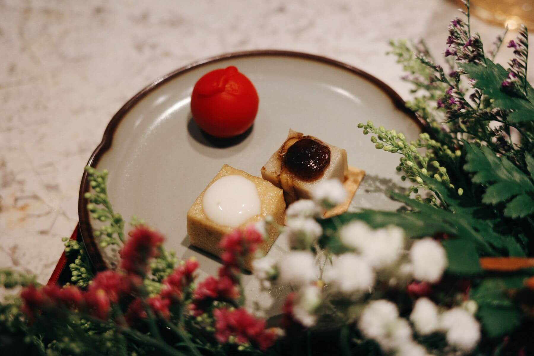 9道精緻小食,其中部分運用台灣食材:番紅花餅乾配小白蝦、墨魚餅包裹起司、菠菜泥餅乾與帕瑪森起司、海膽茶碗蒸、豆腐佐起司洋蔥湯濃縮醬等汁。多樣化的食材展現,由果香馥郁、酸度平衡的粉紅酒Pairing引人入勝的帶領味蕾逐一體驗。