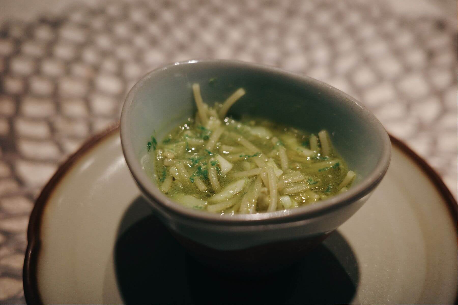 風味前菜的靈感源自台灣「麵線」,但主廚選用「vermicelli」(義大利細短麵 / 線麵)來詮釋,作為亮點的清爽綠咖哩醬汁,與海鮮相互牽引出獨特鹹香風味。