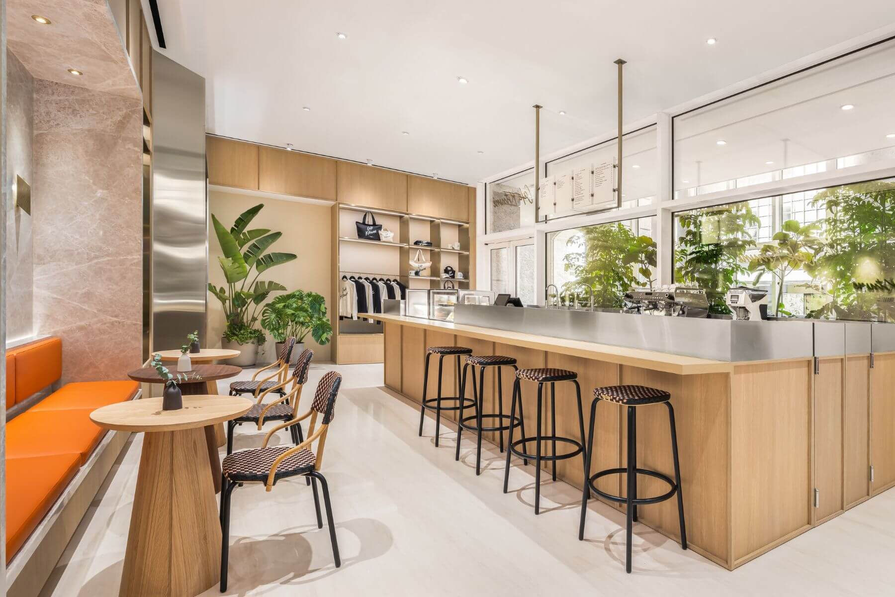 符合日法混合的精神,空間以日本和室為靈感,運用原色木板與屏風線條,粗獷的大理石與人字紋木拼接工藝亦傳遞法式建築常見細節。寬敞明亮的空間裡不僅有Maison Kitsuné 的商品陳列,也同步引進旗下咖啡團隊Café Kitsuné 進駐。