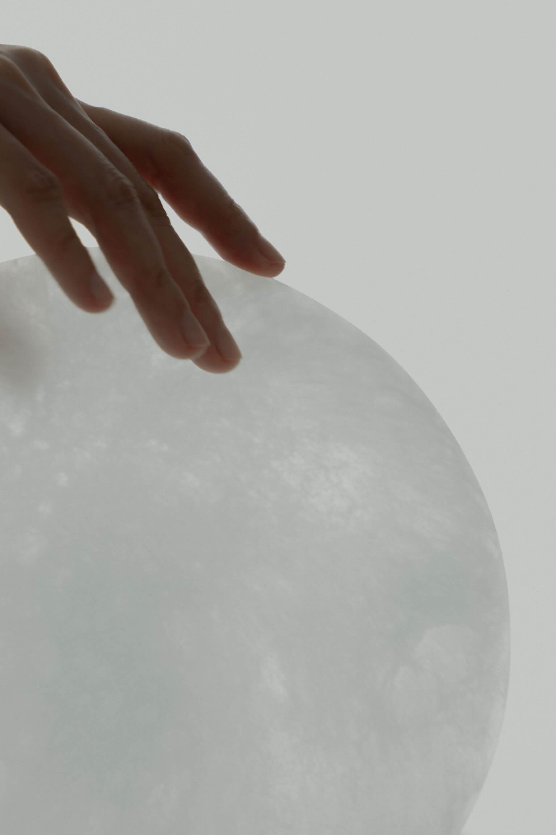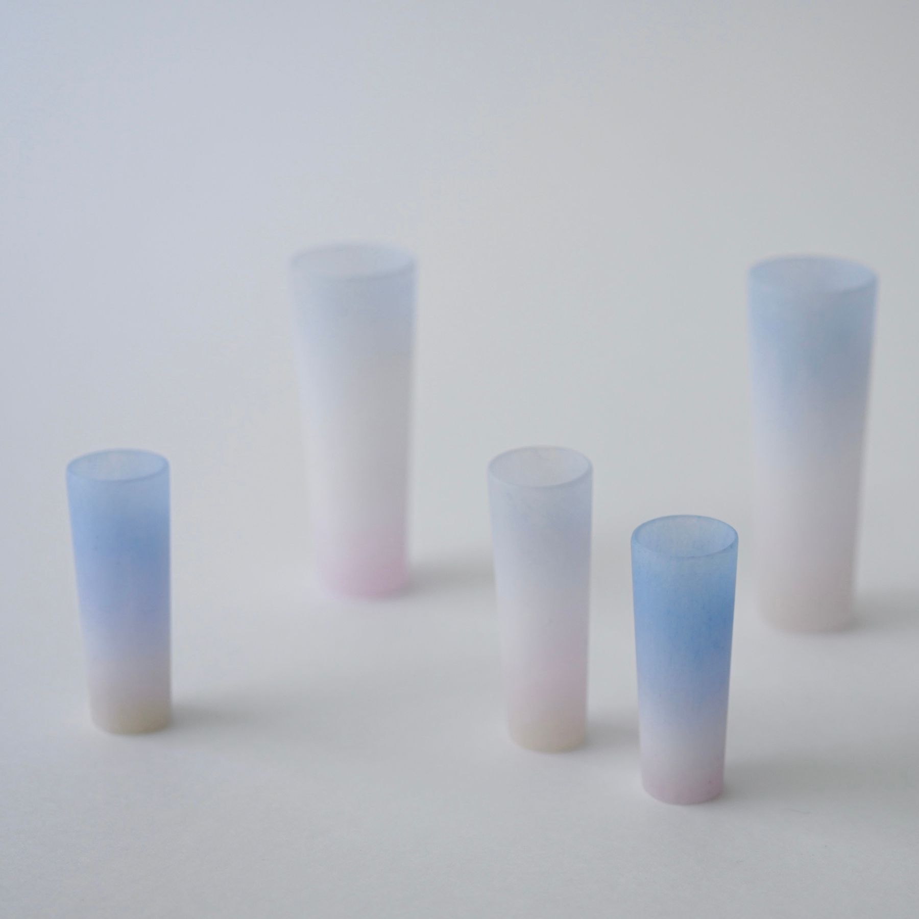 萩原睦則是玻璃藝術家,以「承載記憶的玻璃容器」的概念,捕捉自然光和天空的顏色,並將它們轉化為日常容器的形狀。使用脫蠟鑄造法(pâte de verre)和口吹玻璃的技術創作,並以脫臘鑄造(pâte de verre)為主。這是一種自古傳承下來的玻璃鑄造技術,將玻璃粉裝入耐火模具中,經高溫燒製使玻璃熔化,冷卻至室溫後,將模具敲碎取出作品,並打磨加工完成。