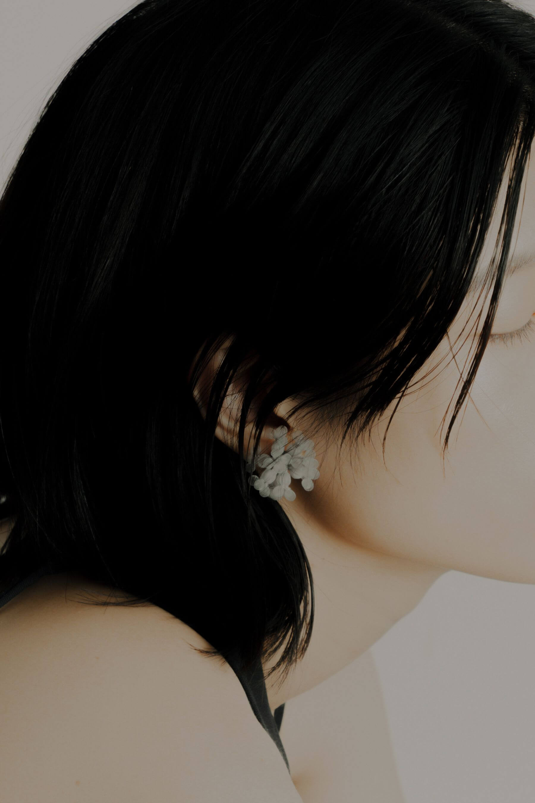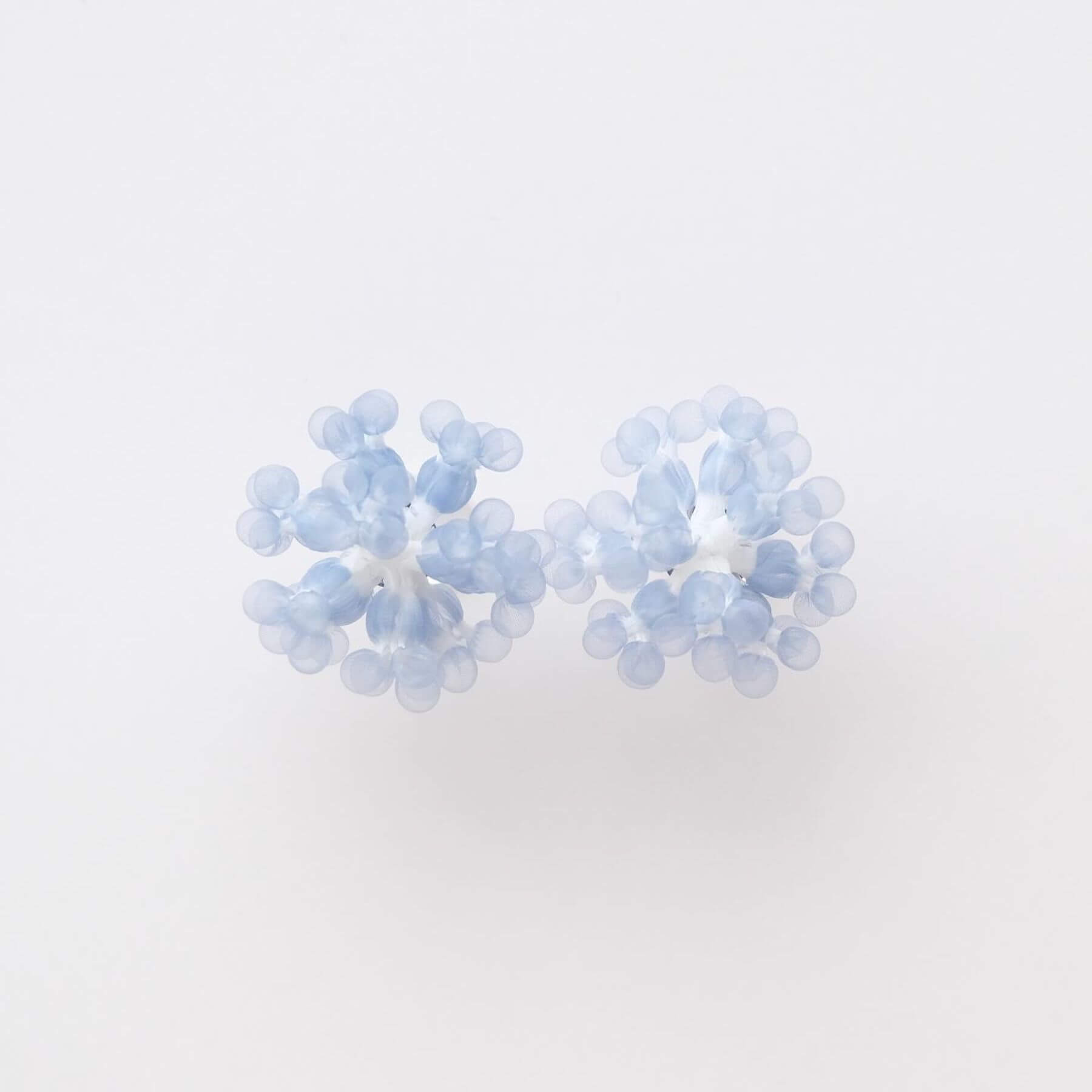 而耳環作品中充滿空氣感的氣泡圖案,靈感來自一種名為「bean-ire-shibori」的絞染技術,以球狀分層並擠壓到一片薄薄的織物上,透過受熱產生的形狀記憶呈現3D立體效果。「Shibori-dye 」在英語中為「tie-dye」,「tie」一詞有捆綁、連接之意,此技術注重擠壓過程的行為,僅使用單線和擠壓的壓力來成型。通常線在擠壓和染色後就會散開,但美於奈的作品透過綁好的線保持原樣,絞染的過程便更有吸引力,巧妙地表現出「連接」的概念。