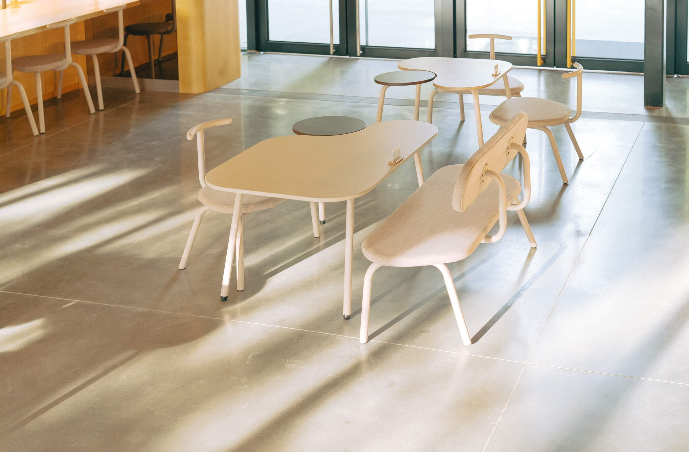 彡苗空間實驗負責內部設計,以蛋黃、蛋白、蛋殼的比例進行場域功能性分割,模擬空間被校園各區域包圍的中心。家具設計採用木製48板材,強調耗損最小化的裁切,保留柔軟、包容、流動、可聚合及拆解的桌面使用,創造豐富但安定的使用情境。