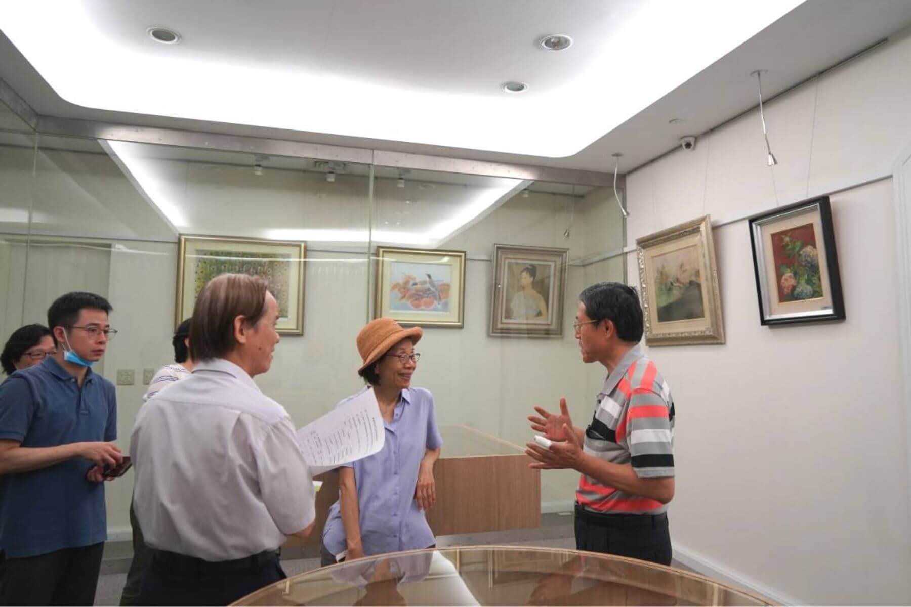 總策畫蔡家丘(左一脫口罩者)和顏娟英(戴帽者)於國立臺中教育大學調查畫作收藏。(圖/春山出版提供)