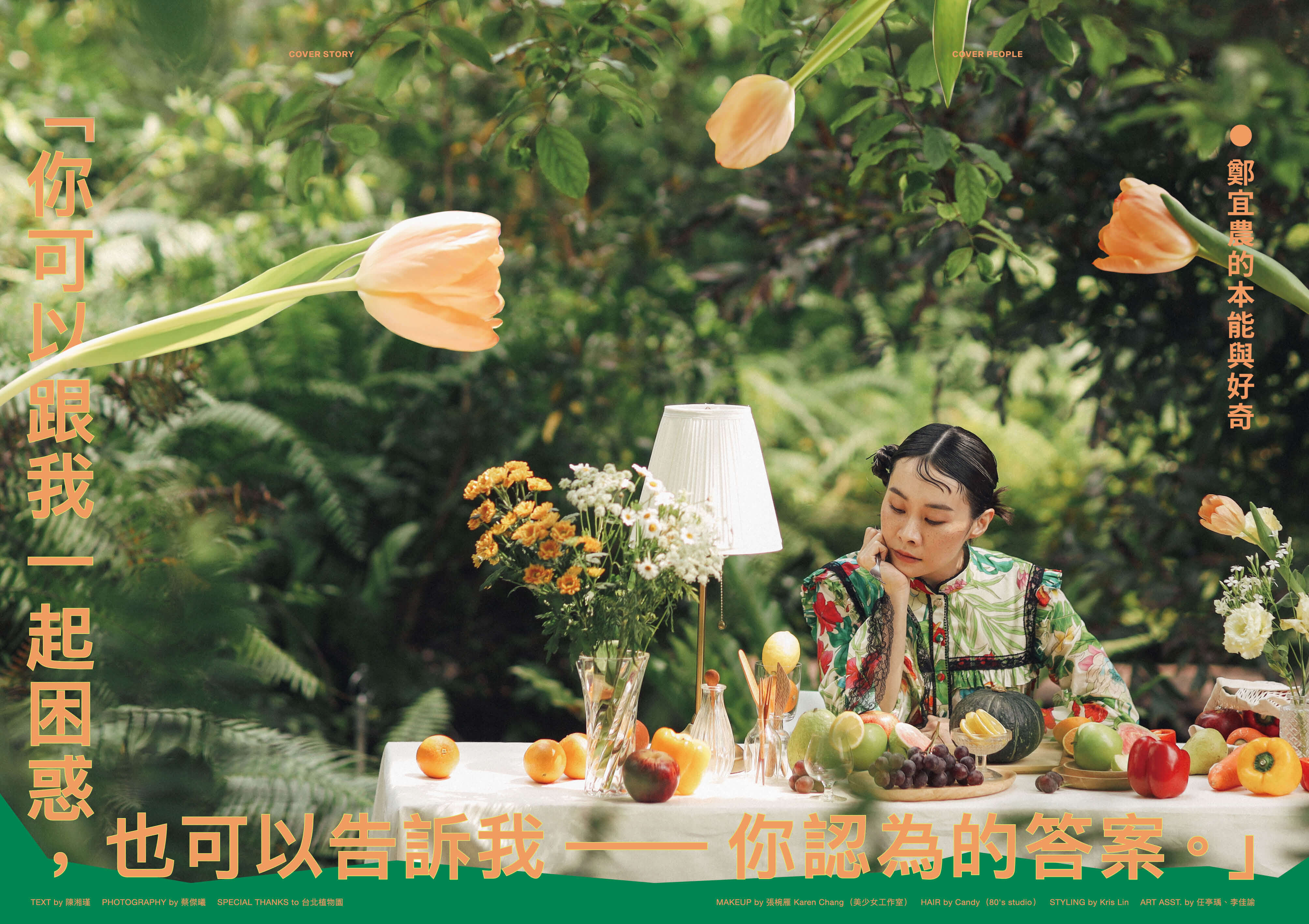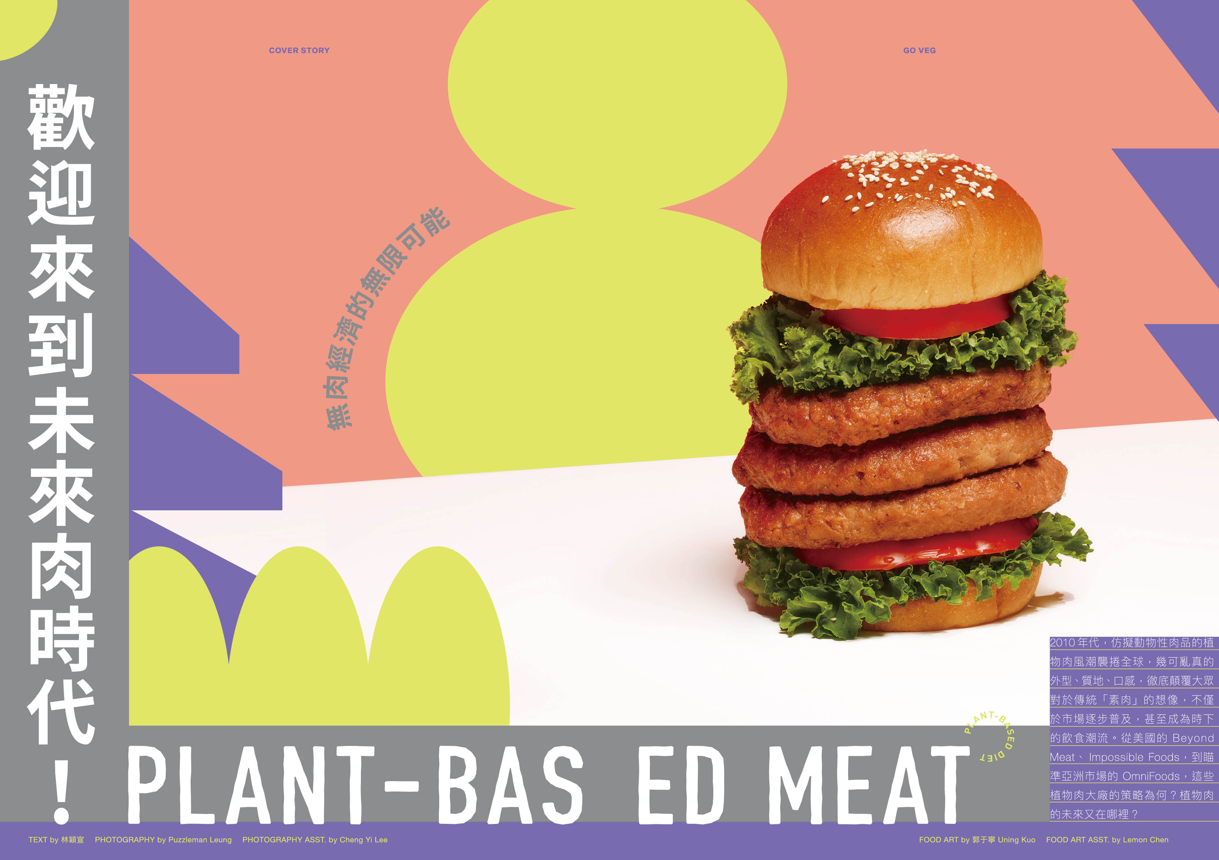 封面人物鄭宜農就是一位彈性蔬食主義者。我認識宜農超過十年,看著她憑藉強大的才華和能量,對許多議題和價值發聲,一步步成為這個世代最有代表性的創作歌手。我相信,此刻只是她創作人生大爆發的新起點。另一個封面是全植物肉的漢堡,是與食物設計師郭于寧和知名攝影師 Puzzleman 的創作。