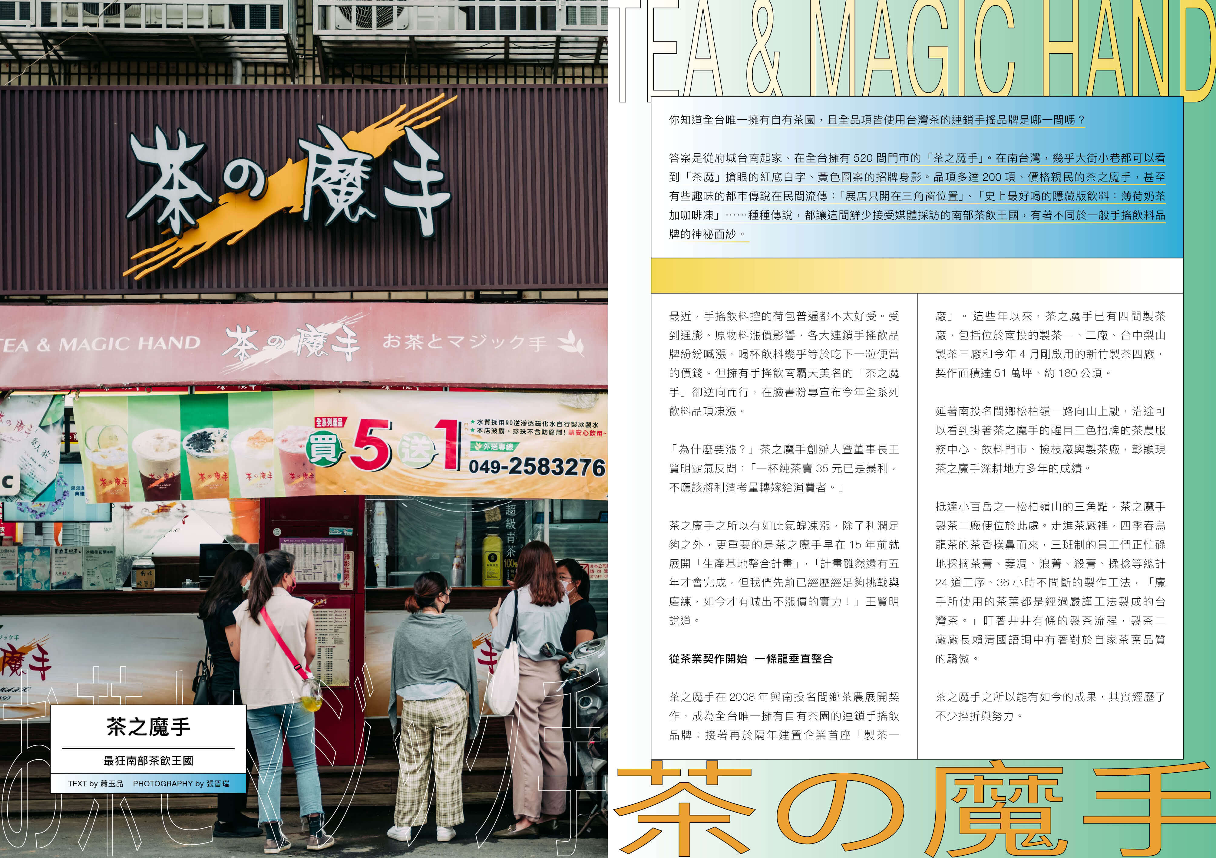 Creative Business 單元深入挖掘南台灣最大的手搖飲料店——「茶之魔手」, 你或許不知道,他們是全台唯一擁有自有茶園,且全品項皆使用台灣茶的連鎖手搖飲料店。同樣對茶很有研究的,是微型飲食創業家、「土生土長」創辦人顧瑋,她在本期分享如何建構一個共好的飲食生態圈。