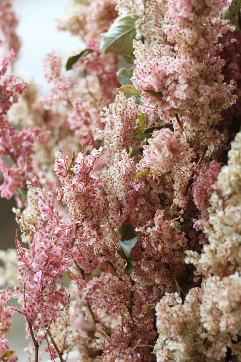 立秋過後,暑氣依舊,但開始能在午後雷雨過後感受到一絲涼意,花市攤位上悄悄地出現了虎杖花,讓我們好不驚喜。生長在高山的虎杖開滿花時,在山頭上會變成嫣紅的一片,合歡山、大雪山一帶會浪漫的像屬於山林的慶典。虎杖的花其實是白色,迷人的紅色來自它的種子膜,一般 8 月底到 10 月虎杖會在花市裡出沒,自從認識這個迷人的植物後,每年都會幫自己做個虎杖花圈,把堅硬而乾燥的虎杖莖慢慢壓進藤圈裡,美麗的姿態隨著乾燥的過程,色澤由鮮豔轉為一種時間停留的色澤,看著它就能感受到屬於秋天的幸福。