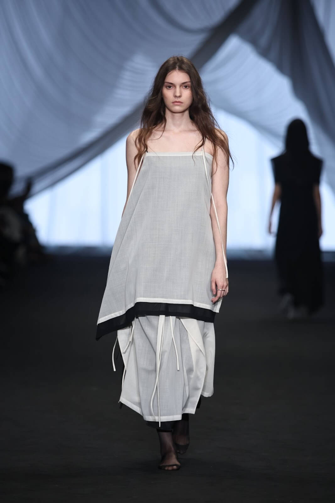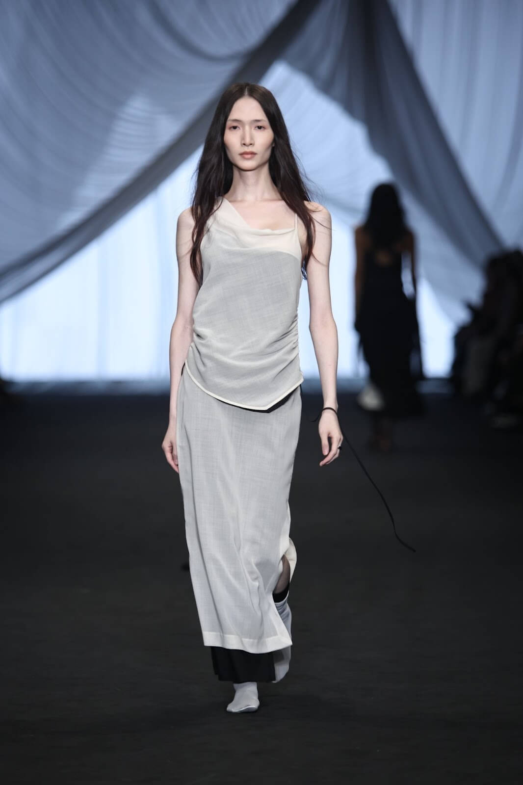 呼應著系列服飾,秀場以三層紗呈現包覆感,帶領嘉賓進入編織的「夢境」。Hua提到,這一季主要探討工藝的提煉,不僅昇華設計,更在面料、版型上呈現不同層次的變化。他也分享,相較於第一季的工整,現在的整體設計走向更為成熟、柔和,更能領會出布料優美的曲線。