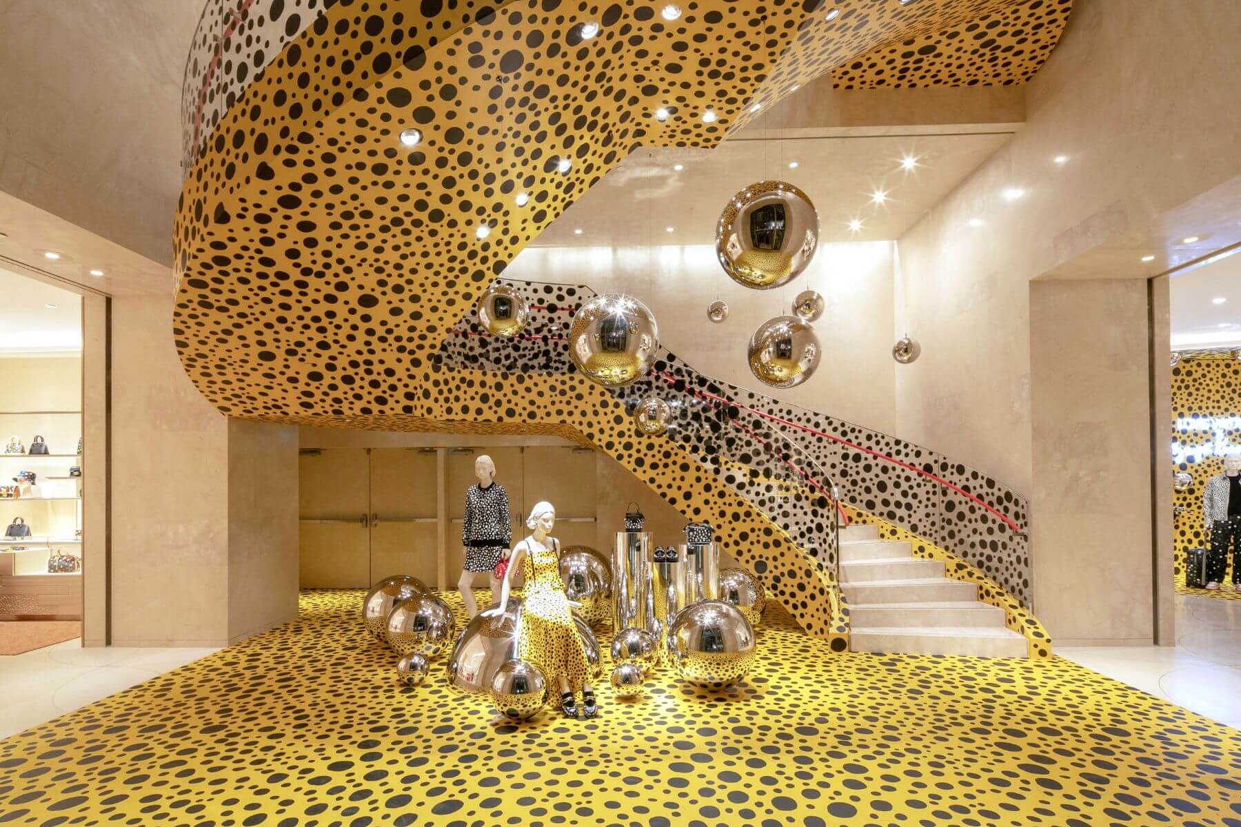 為慶祝台北101旗艦店盛大開幕,店面中庭挑高區與男裝區換上限定黃色迷幻波點,向台灣顧客隆重呈獻該店與日本藝術家草間彌生的聯名系列。首波上市系列包含彩繪圓點 Painted Dots、鏡面圓球 Metal Dots、無限圓點 Infinity Dots 與迷幻花朵 Psychedelic Flower,渲染於女士與男士時裝、皮件、飾品配件和香水,將草間彌生獨特筆觸圓點和路易威登的 Monogram 圖案碰撞出趣味火花。