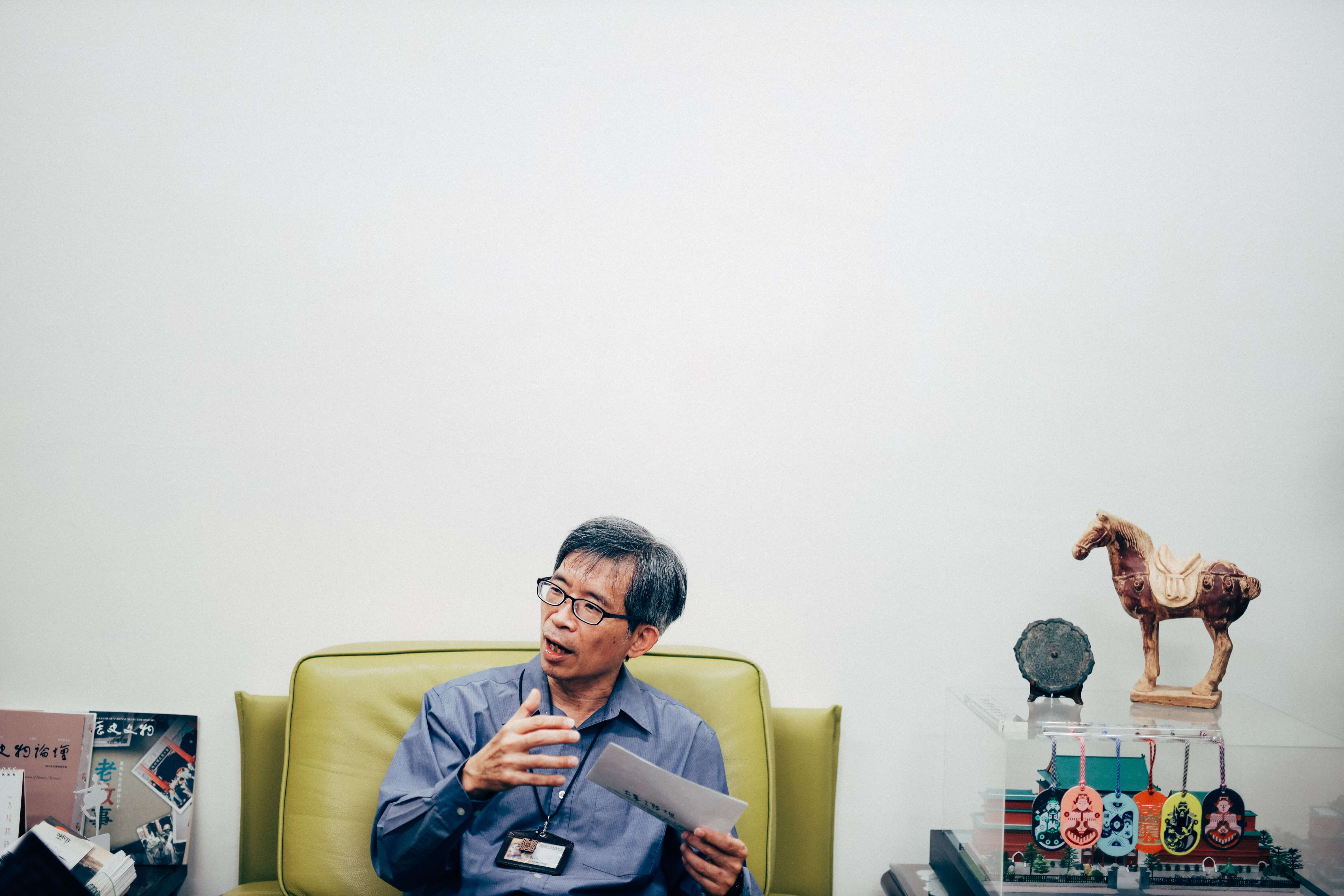 正在國立歷史博物館館長臨時辦公室接受 VERSE 網路編輯團隊採訪的館長廖新田