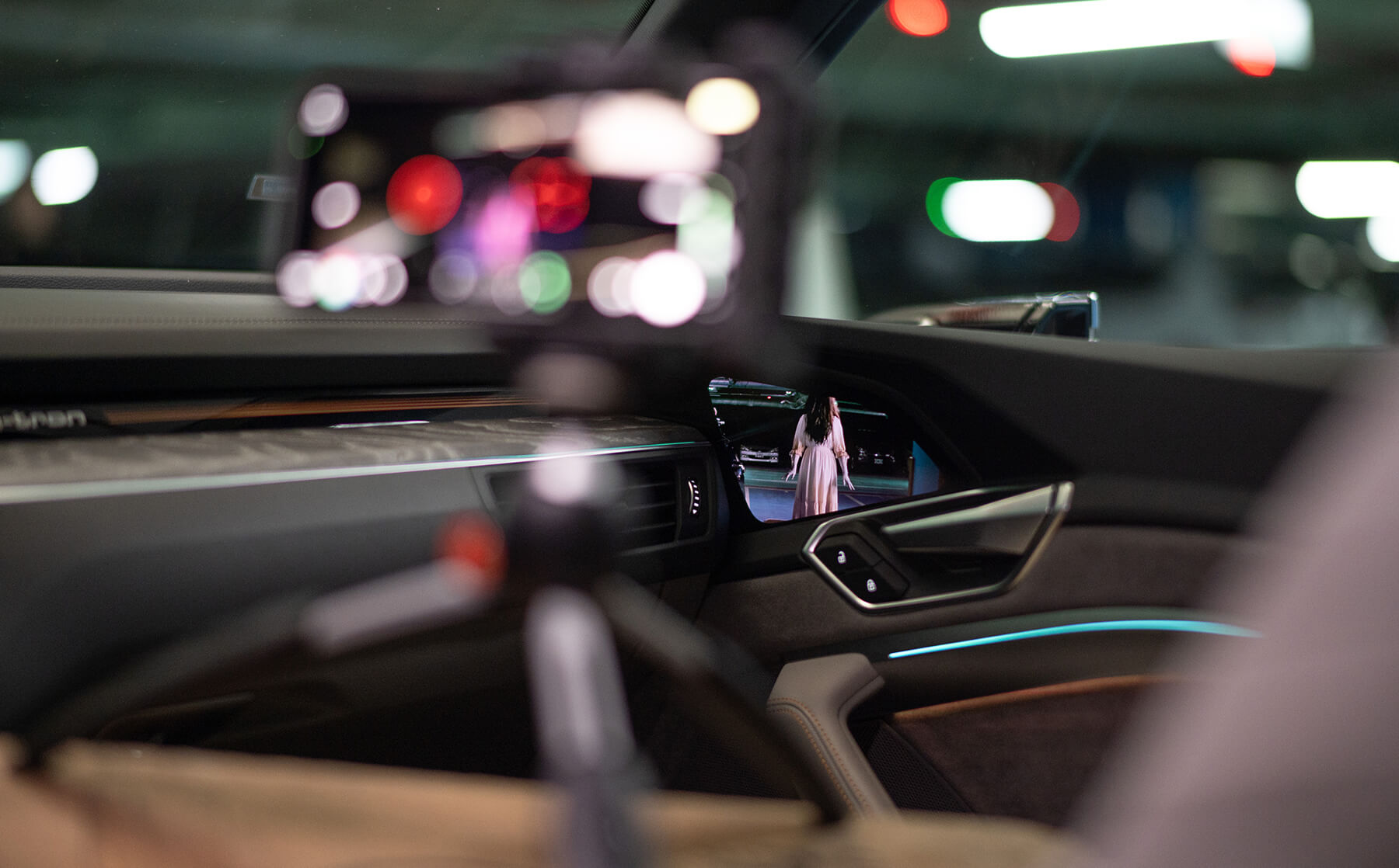 影片細節中也藏有許多驚喜,例如女鬼倒映在數位螢幕的的虛擬後視鏡中,為影片延伸出神秘的異度空間感;而男主角駕駛Audi e-tron電動車在深夜行駛過西門町的街頭、女鬼坐在後車廂上隨著電動馬達的電流聲飄動,也在驚悚之餘增添了導演的幽默感。