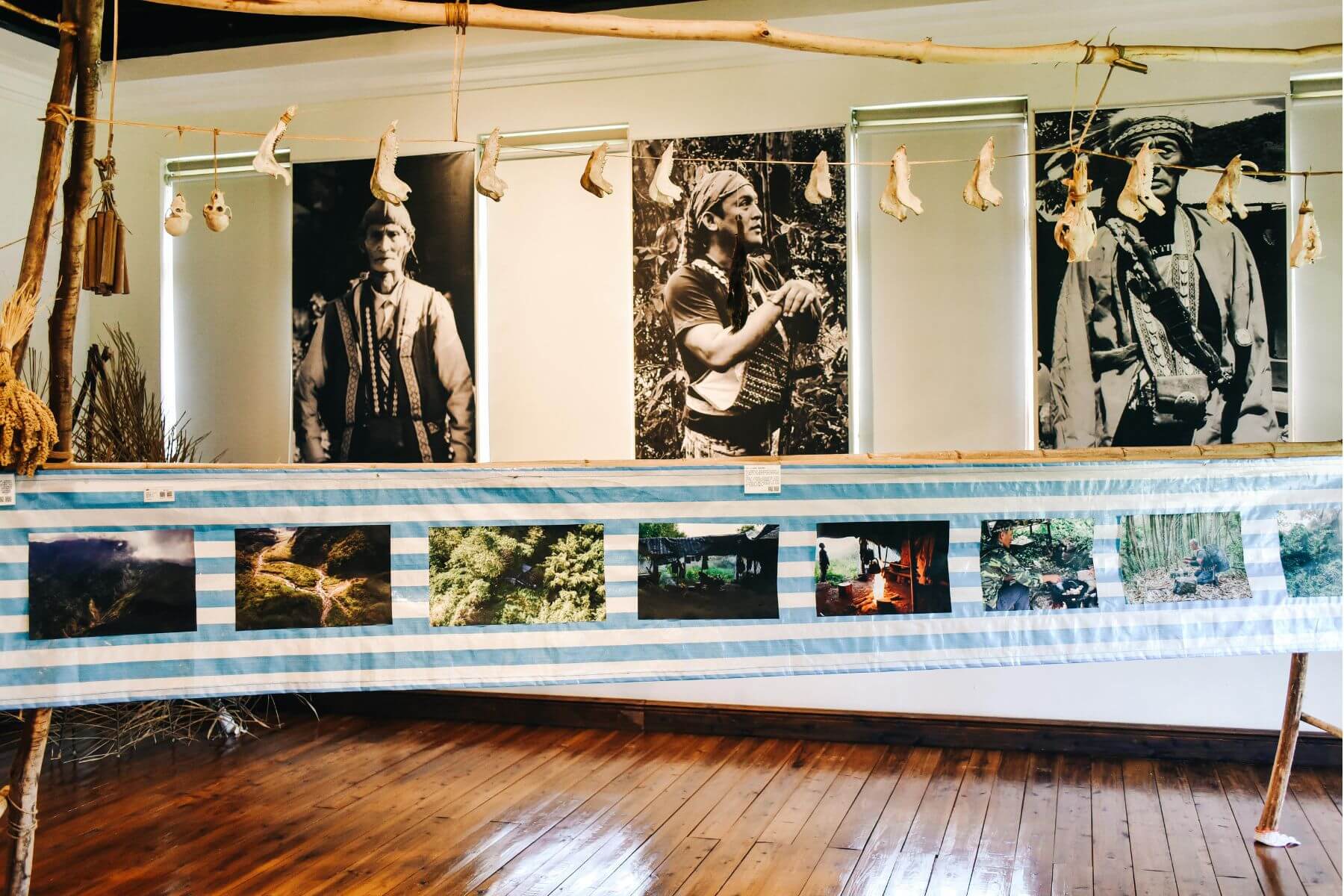 總爺藝文中心的其中一處展館,這裡展出30年代由瀨川孝吉與湯淺浩史所拍攝的珍貴照片,以及策展團隊成員對鄒族狩獵文化的實物探討。(攝影/PJ Wang)