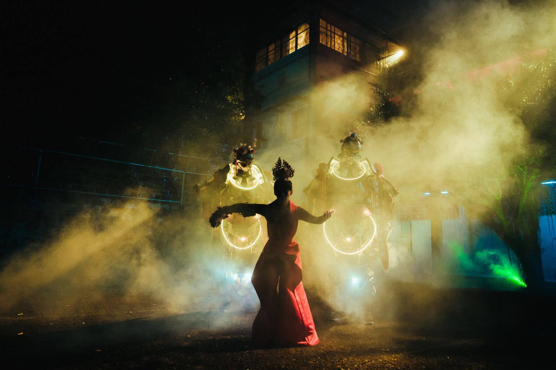 玩完這兩個地方,下半夜的時候能選擇兩條路:往士林官邸或是臺北科學藝術園區。這兩個地方風格截然不同,士林官邸我們給它一個「暗黑童話」的主題,白天是很美的庭園、蔣總統的官邸,然後晚上我們就把平權議題、運動的主題帶進去,幽暗的環境裡,讓毀容姐妹會在上面表演、請羅智信在西式庭園做了一個辯證美醜之間的雕塑,那邊出現一個舞踏、這邊又出現一個Drag(變裝皇后)的表演,甚至可以在晚上看見蔣總統和夫人當時居住的地方⋯⋯把畫面打開,士林官邸就這樣活起來了。