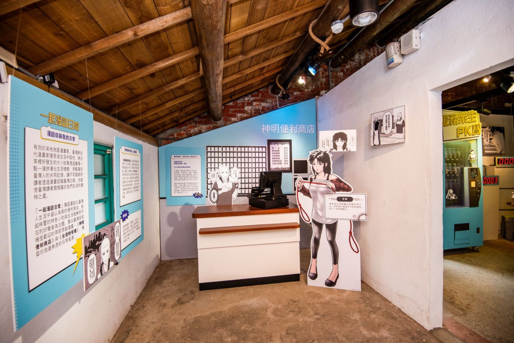最後是主題的多重宇宙,像是1號展區「一起漫話日常」有庶民、有神明、有特有種食物,特別邀請了《台灣特有種》的作者茜Cian 創新繪製了桃園特有種——「米干」和「涼蝦」,讓漫畫與龍崗在地風土有所連結。而馬祖新村的展區恰巧有著一小間一小間的特色,策展團隊也在通道上做了小巧思設計,循著展覽動線前進,從一個不同主題跳到另一個去,彷彿真的穿梭多重宇宙一般。
