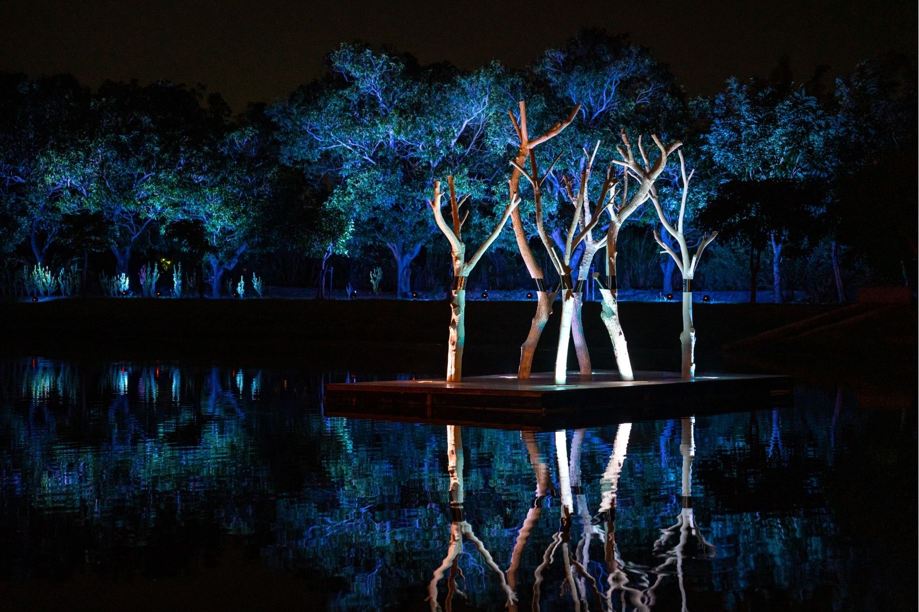 當作品分布在月津港眾多水域,作品與周遭環境、甚至作品與作品之間的互動,也激發出與往年不同的火花。都市藝術工作室總監杜昭賢特別提及,「今年燈節特別規劃有許多呼應光環境的大型裝置藝術,」諸如藝術家曾瑋創作的《白色森林》,在月津港的開放水域置入一片孤獨、迷幻的森林,在四周光環境的效果加乘下,創造出有如水上劇場的魔幻感受;而台灣藝術團隊「有用主張」(UxU Studio)操刀的《運用幻象–瀑布》,則將月津港水域打造成超現實的場域,呈現出身處太空的氛圍,是饒富趣味的現地創作。