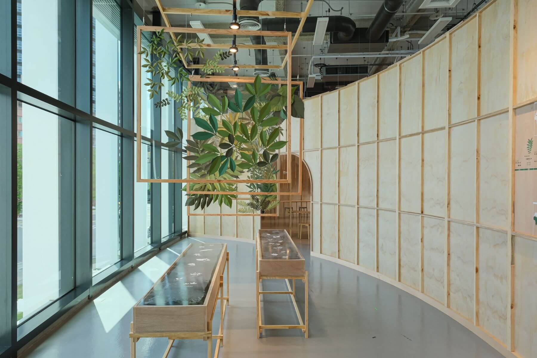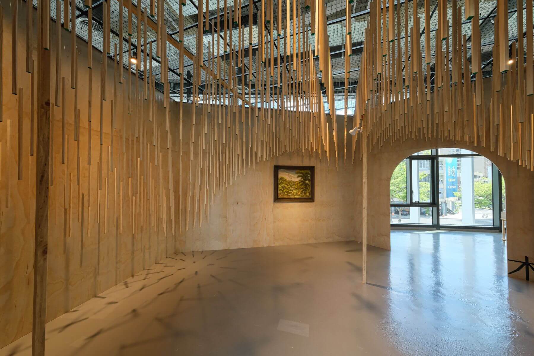 空間設計部分,策展團隊邀來去年參與嘉義火車站改造計畫的「本埠設計」建築師蔡嘉豪操刀,打造出宛若嘉義街道的展場動線,其中更滿布著從天而降、逾六千條木紋夾板,藉此傳達擁有六千棟木構建築的「木都」嘉義意象。蔡嘉豪分享,儘管要完成數目如此龐大的木條陳設,確實有風險存在,但最初與徐景亭提案時,雙方很快便達成共識。