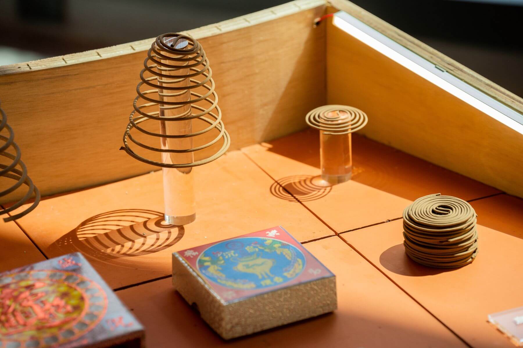 後來,展區決定以廟宇的日常為藍圖,呈現採集自嘉義東市場的諸多信仰相關物件,在呼應廟宇與市場色彩的展座上,陳列著種種祭祀用品,上頭掛有由在地燈籠工藝師傅鄒弘義親自製作的手工燈籠,走逛其中,可以感受到該展區具體而細微地顯露這座城市豐盛的民俗氣息。