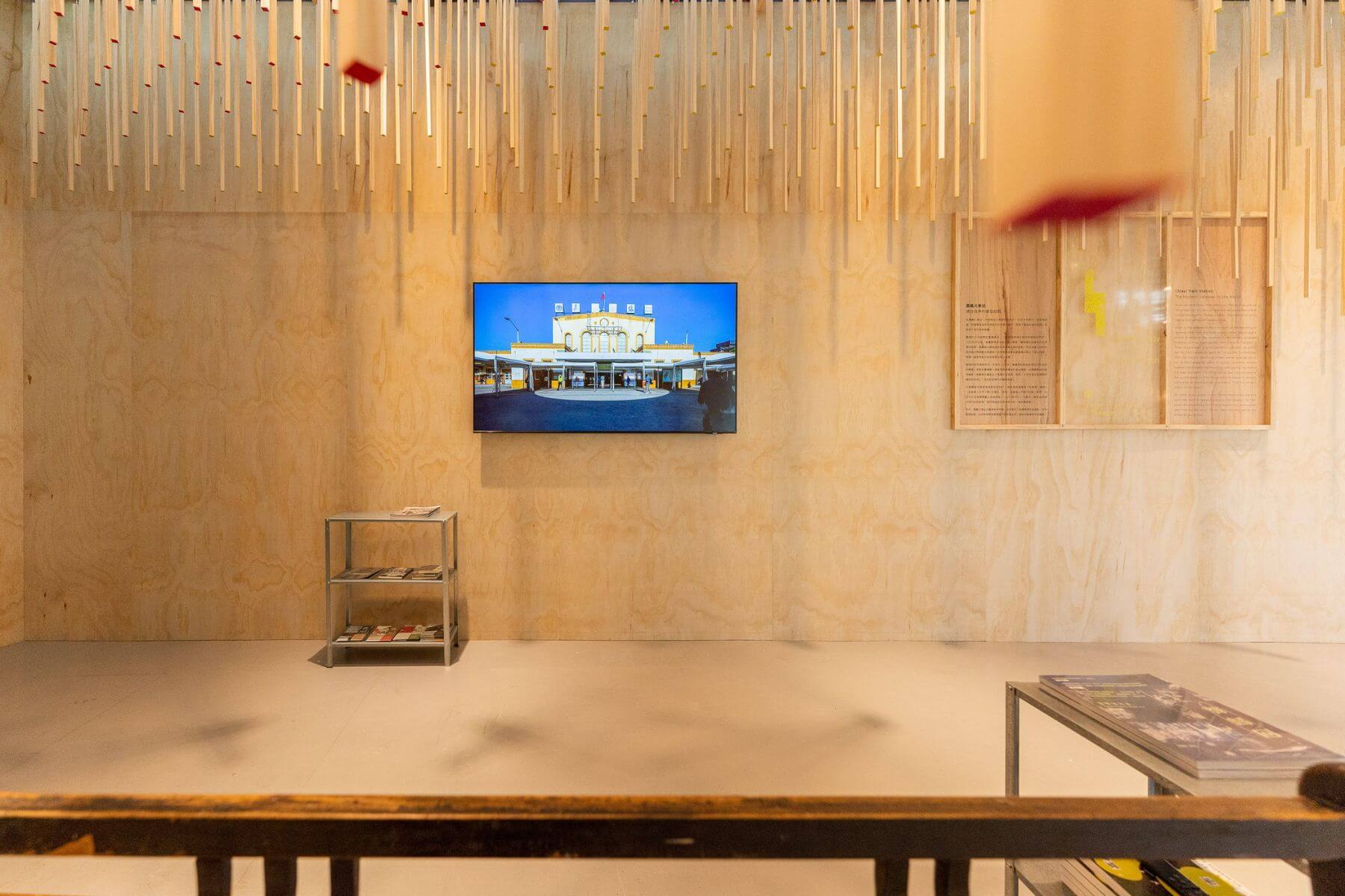 候車亭區域提供關於嘉義火車站的重要紀錄影像,也供觀展民眾休憩、閱覽各式豐富的嘉義在地出版品。(圖片/台灣設計研究院提供)