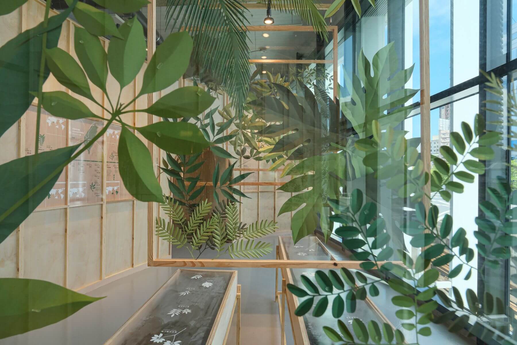 循著《展望諸羅城》出發,擁有超過百年歷史的嘉義樹木園是嘉義館裡頭的第一個子區。嘉義樹木園在日治時期曾是橡膠樹與熱帶經濟樹種的殖育試驗地,是日本帝國發展熱帶林業的重要基地,戰後轉型為植物園,不僅持續研究任務,亦與在地民眾的生活緊密連結。本次策展團隊透過實地勘察、訪談與資料整理,自這座百年植物園的悠遠歷史出發,梳理出今日嘉義樹木園的代表性樹種,並攜手剪紙藝術家、「紙物」主理人Wuba Yang重新詮釋這些歷經百年仍生機盎然的生命,讓觀者在欣賞藝術品的過程,也能更瞭解蘊藏在這座城市中森林的文史與知識,「四個畫框呈現的是,隨著時代遞進嘉義樹木園所栽植不同用途的植物,而畫框本身也呼應著展覽軸線最前方的《展望諸羅城》。」Wuba Yang說。