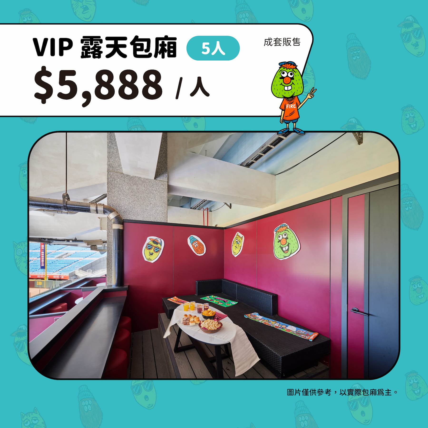 火球祭此次特別推出全新 VIP 票種,希望仿效海外音樂祭的貴賓票種,要帶給樂迷極致的享受體驗。VIP 票種分為 5 人、8 人、10 人三種包廂,並座落在棒球場三樓,視野一覽無遺,是觀賞演出的絕佳位置。VIP 除了擁有獨立包廂、不怕被打擾,更享有多項尊榮待遇包含:由專人引導快速通關入場、每人可獲得火球毛巾以及特殊大禮包、雙日份酒水零食、可優先購入周邊商品,8 人、10 人包廂更有冷氣以及獨立室外座椅可供使用,票種一公布便引起樂迷關注。