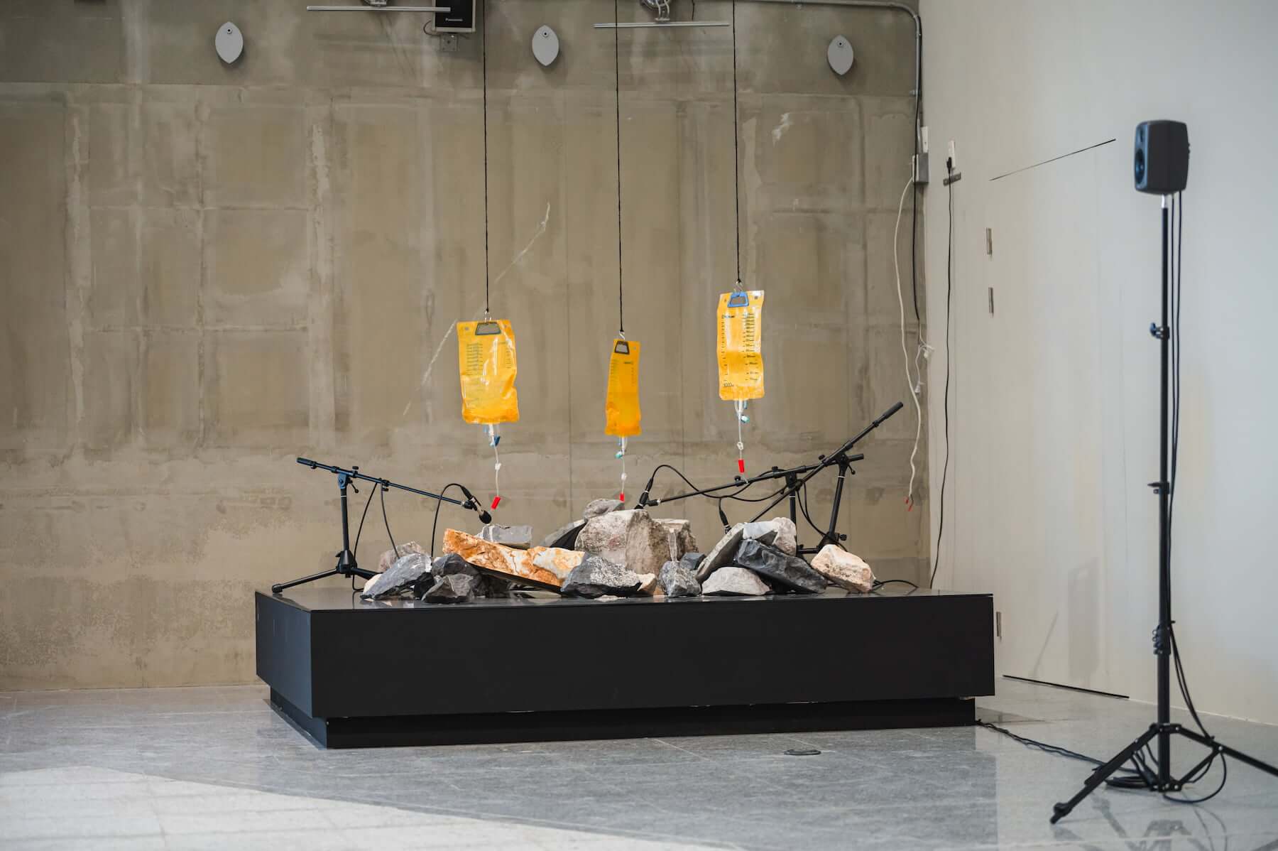 如日本藝術家大和田俊的作品《發掘/史前太平洋》,將檸檬酸滴在由史前海洋生物屍體堆積而成的石灰石,使其發生化學反應,數億年前的二氧化碳也被釋放到現在的大氣中,傳來非常微小的氣泡破裂聲,這些聲音被麥克風拾取、放大並發送到展覽空間中,一靠近彷彿就能聽見遠古時代的聲音。
