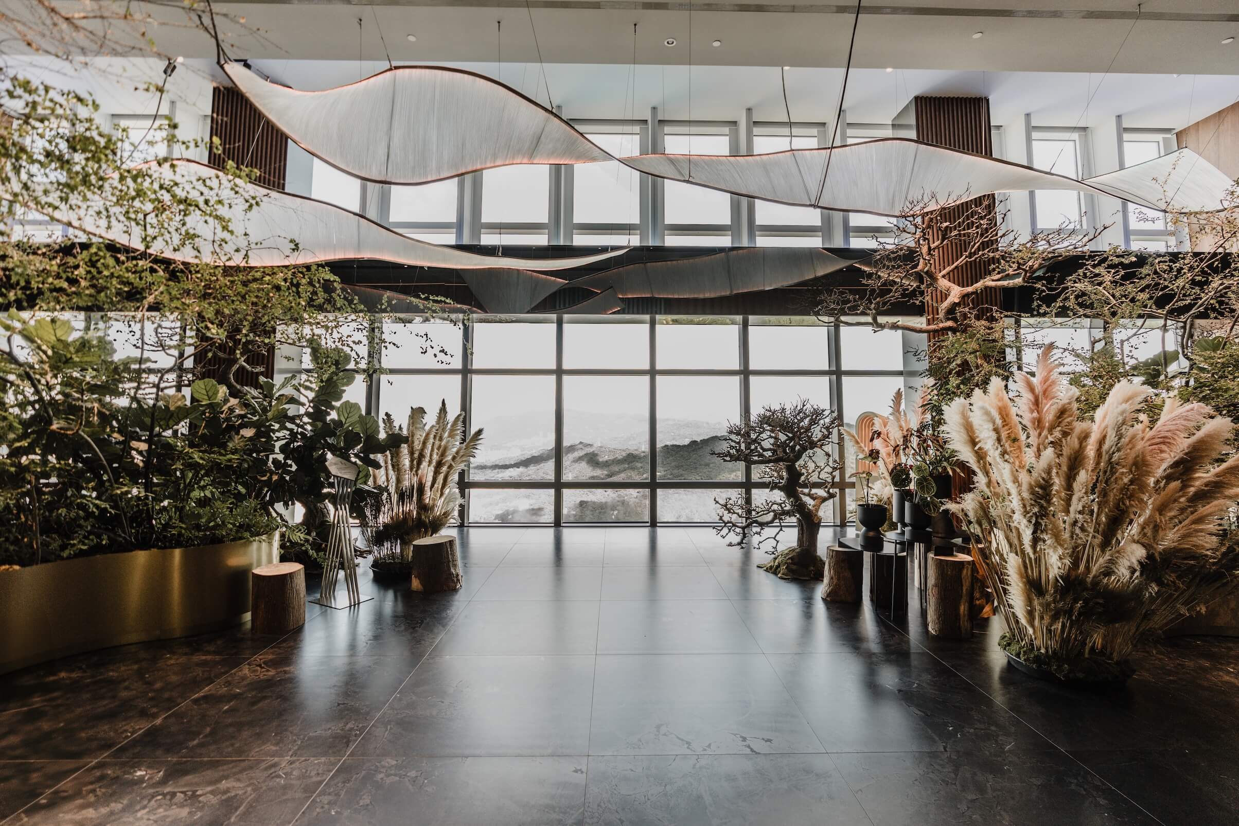 桌花藝術也轉換成涼秋場景,巧妙運用了當季的自然色彩,深赤土色將日落的溫柔光芒帶上了餐桌——薰衣草的柔和淡紫色,義大利小蘆葦輕輕搖曳,雪草的白色絨毛質地柔軟,牽引出秋冬時節的優雅與蕭然,為接下來的用餐時光帶來浪漫氛圍。