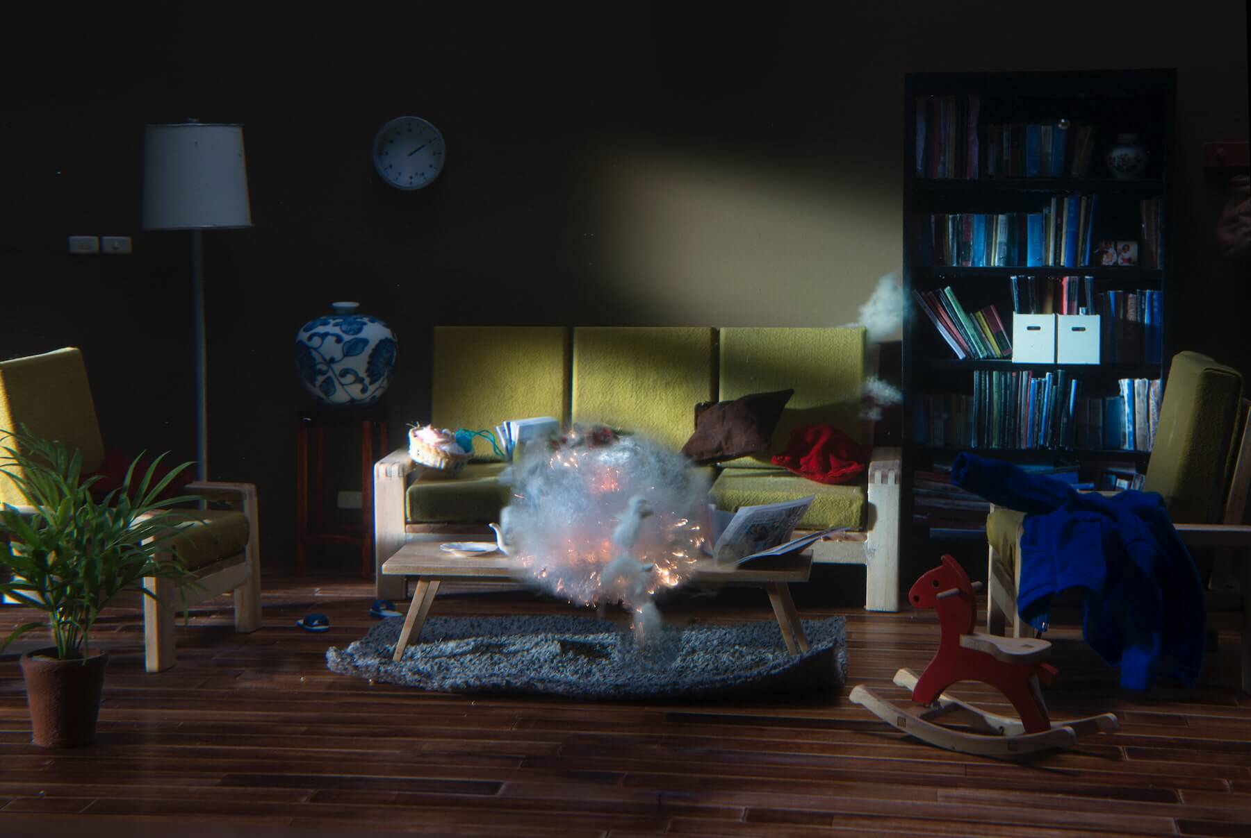 地毯、椅子、沙發的佈置,呈現一個尋常中產階級的午後的客廳,但如果仔細看影像,會發覺哪裡好像怪怪的——地毯的一角有一點飄起,襯衫、報紙也似有些漂浮,空中懸浮幾顆類水珠的物體,讓人有種莫名的不安感,隨著後續的爆炸,觀眾才會發現,原來整個場景是在水中拍攝的。為什麼是水中?因為袁廣鳴思考人類最安全的生存狀態時,最終想到的是安居在母親懷孕時腹內羊水中的嬰兒。