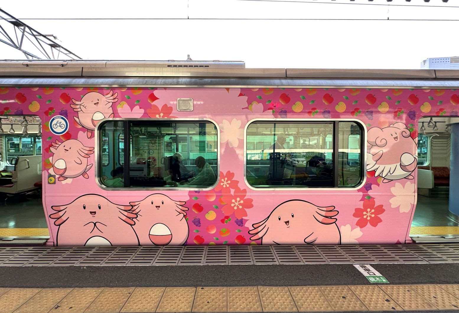 寶可夢粉絲走訪吉利蛋公園之外,也不能錯過寶可夢列車。行駛於福島縣與宮城縣之間的阿武偎急行,在2022年7月開始運行「阿武偎急行 拉普拉斯×吉利蛋彩繪列車」,列車從裡到外都可看到可愛的吉利蛋與拉普拉斯,在福島站、保原站、梁川站、丸森站、角田站、槻木站還設有露臉看板讓大家拍紀念照,福島站與槻木站的月台上的車站看板也有精心裝飾。