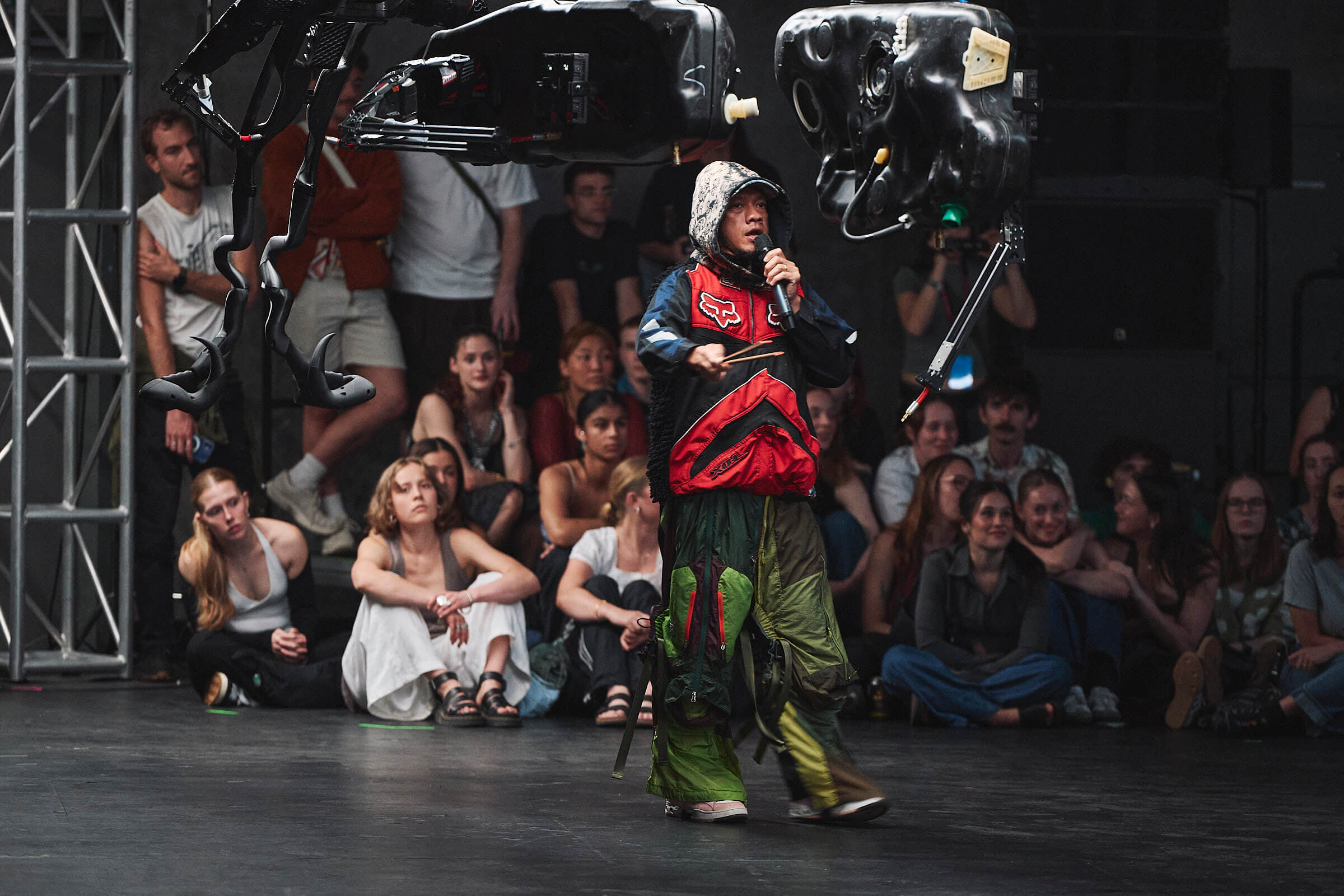 六位頂尖舞者穿戴著以越野機車零件回收打造的機械裝置,在爪哇迷幻電音的激昂節拍中,化身為「半人半獸的後人類神話生物」。《機神祭》《U>N>I>T>E>D》的視覺設計深受1980-90年代科幻電影、神話符號與峇里島儀式文化影響。觀眾並非單純的旁觀者,更像是獻出自己神魂與心智的參與者,共同成就一場極富儀式感與未來感的沉浸式體驗。