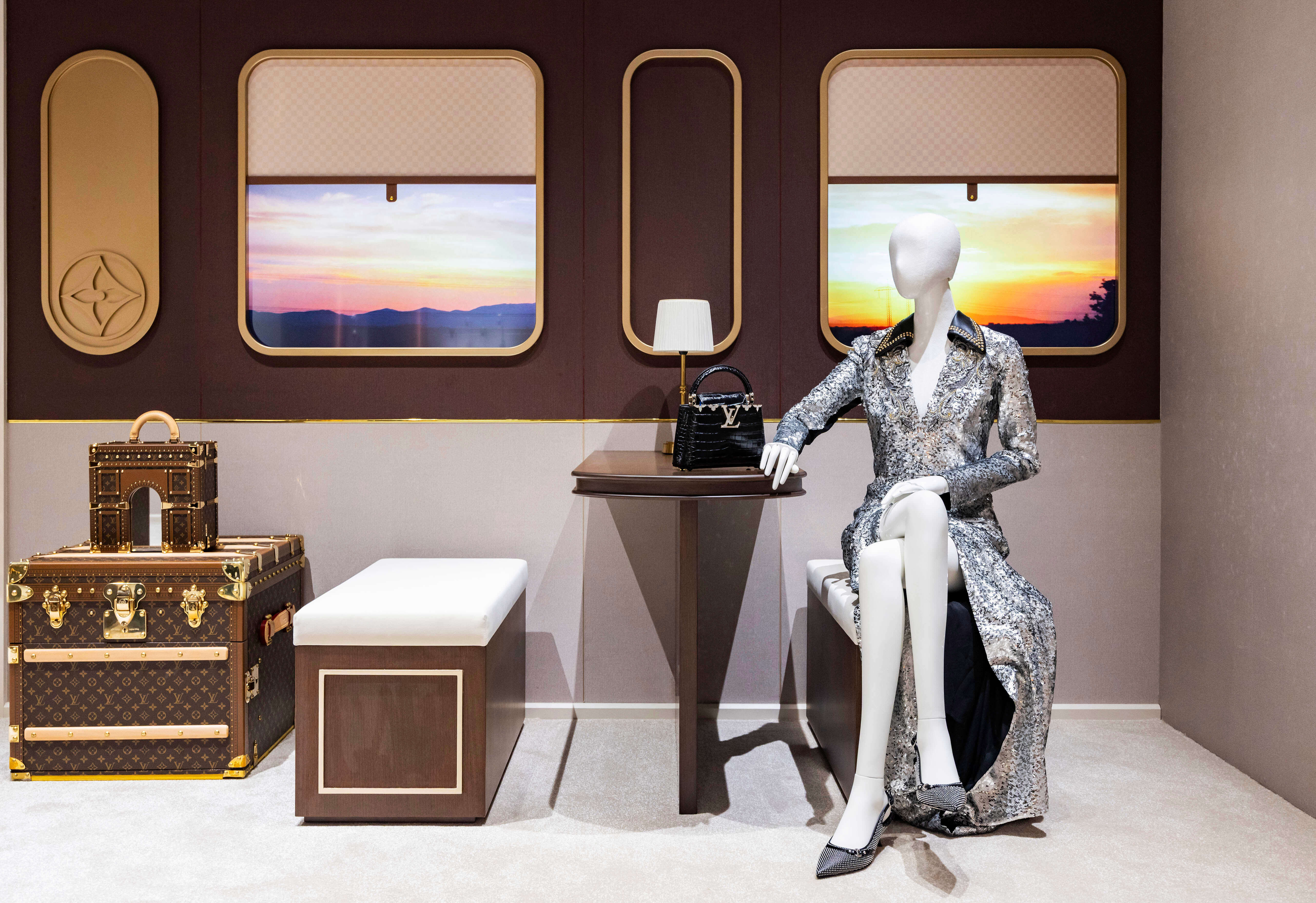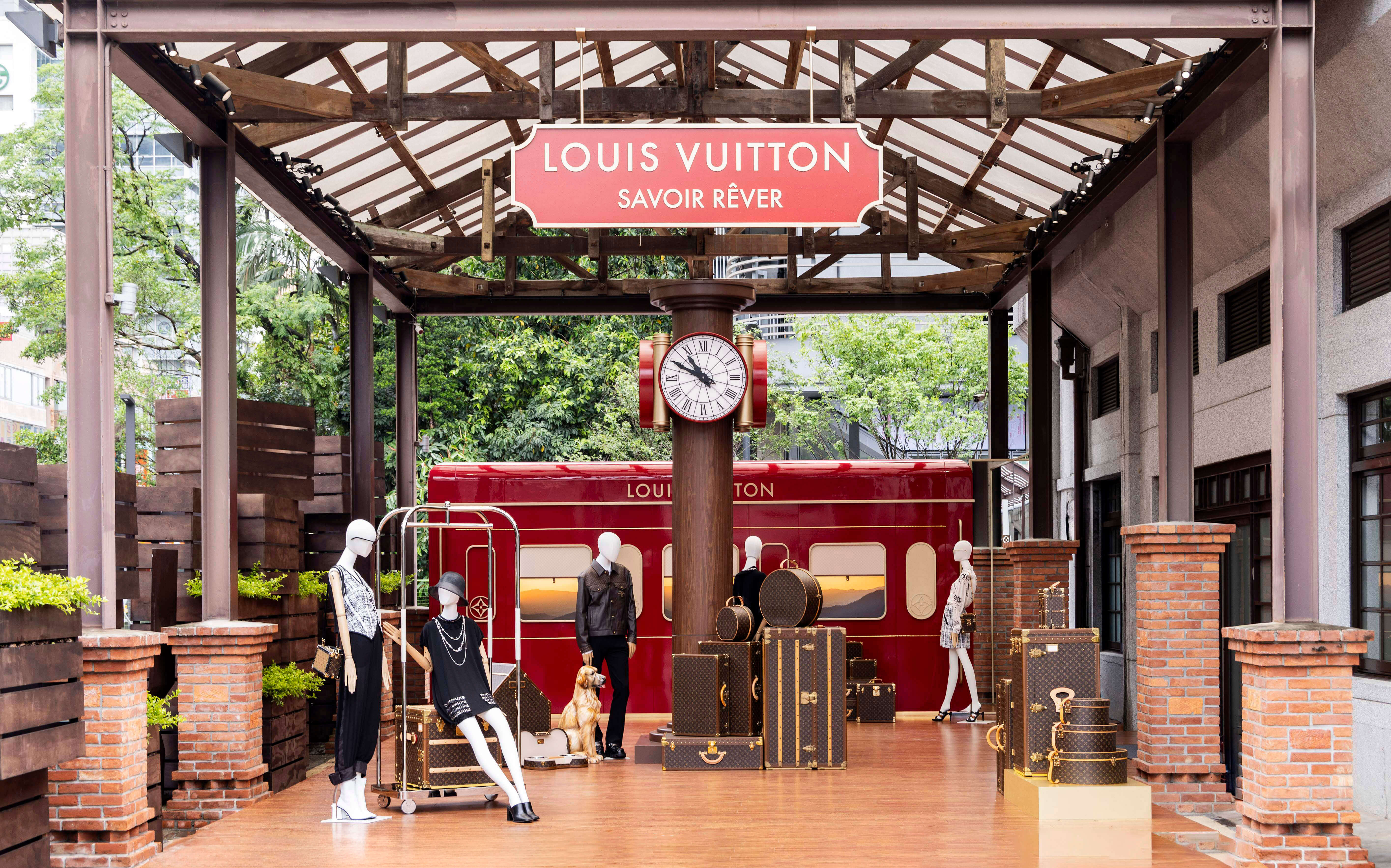 在正式登上列車前,Monogram花朵的發光熱氣球與經典硬箱裝置映入眼簾,象徵著升空啟航的自由精神,月台上的候車場景則鋪陳出旅人擦肩而過、邂逅交流的浪漫氛圍。由Louis Vuitton硬箱堆疊而成的艾菲爾鐵塔,進一步呼應品牌對旅行與探索精神的致敬。