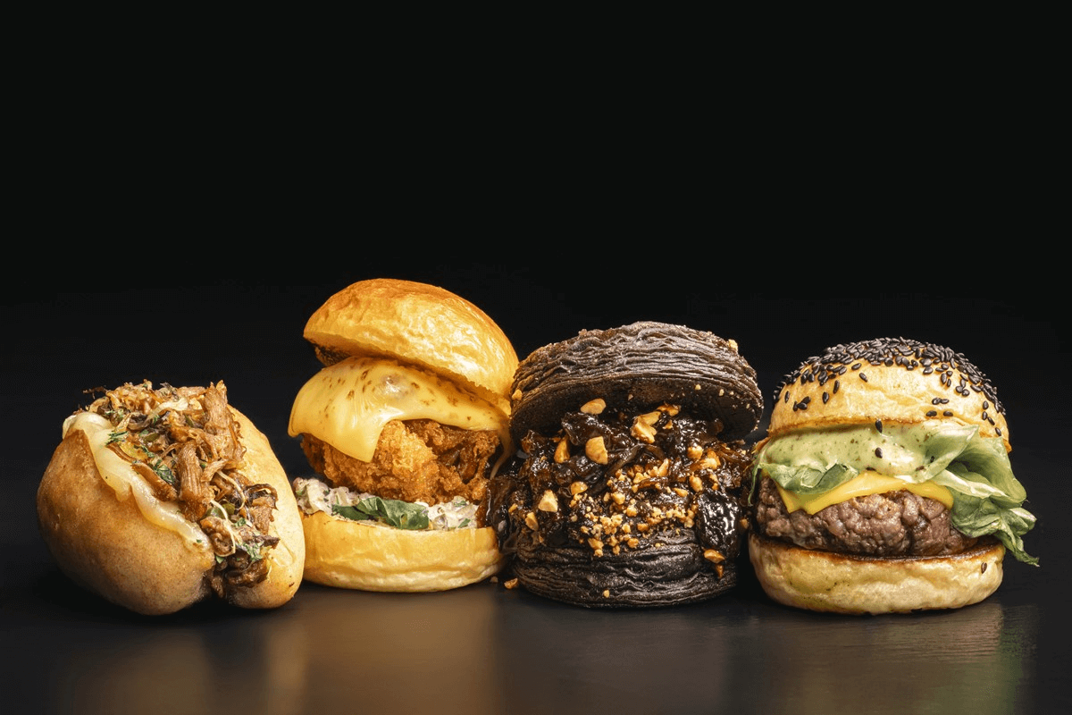 四款漢堡組合包括契作牛隻梅花部位製成的純牛肉漢堡排,搭配濃郁巧達起司與波士頓奶油生菜,完美保留肉香的原始風味;現炸雞腿排佐煙燻咖哩香料與酸香塔塔醬,層次鮮明立體;竹炭可頌甜甜圈包裹濃郁培根醬,鹹香與甘醇交織出絕妙口感;低溫油封鴨腿搭配法式經典醬汁,醇厚圓潤令人回味,絕對是漢堡界的天花板!