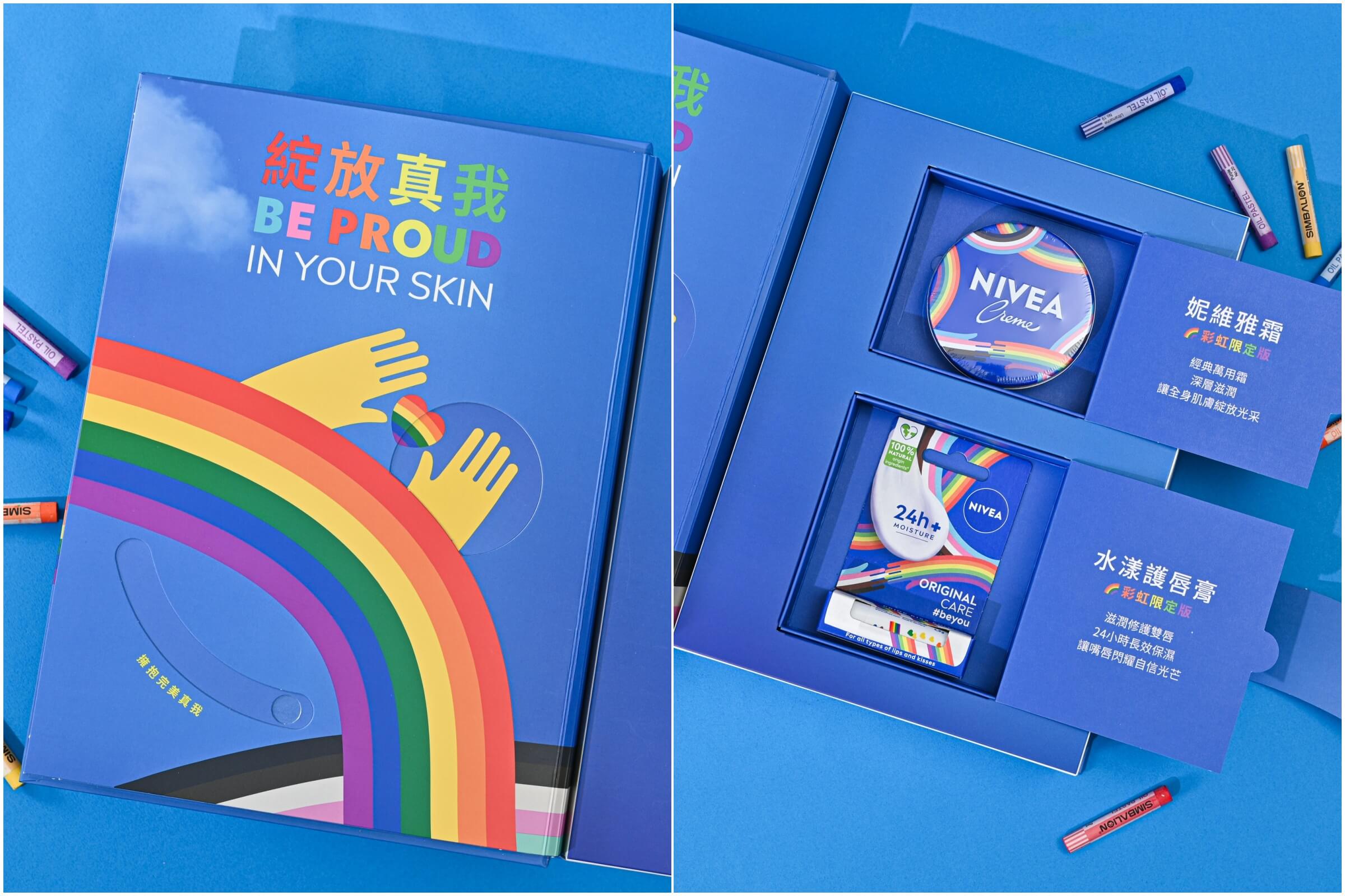 妮維雅以「驕傲、愛與團結」為靈感,將明星商品換上活潑繽紛的彩虹新裝,帶來極為療癒的彩虹限定版包裝妮維雅霜與水漾護唇膏。經典的妮維雅小藍罐以柔和的漸層彩虹,描繪愛的包容與關懷;三款水漾護唇膏則擁有各自獨特的彩虹視覺語彙,包裝分別是牽手彩虹、手指愛心,以及手比愛心+ LOVE IS LOVE。禮盒設計更透過兩隻手緊緊相握的意象,象徵跨越性別與身分的支持與溫暖,打開禮盒如同翻開一本立體書,每一頁都能書寫屬於自己的「綻放真我」故事。